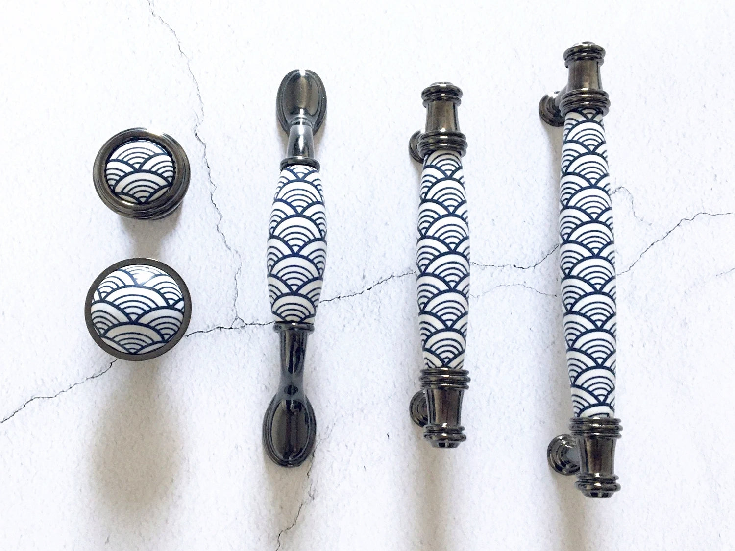 These 3.75" and 5" porcelain cabinet pulls feature an elegant blue and white scallop design inspired by geometric fish scales. Crafted to fit standard 96 mm and 128 mm hole spacing, they offer a refined aesthetic combined with easy installation. Ideal for upgrading cabinetry with a tasteful, durable accent that enhances both modern and classic interiors.