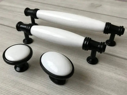 These porcelain drawer pulls, available in 3.75" and 5" sizes, combine classic design with durability. Featuring a white and black finish, they provide a refined look that complements kitchen cabinets and other furniture. Crafted for easy installation, these handles offer both functionality and timeless style, enhancing the overall aesthetic while ensuring reliable grip for daily use.