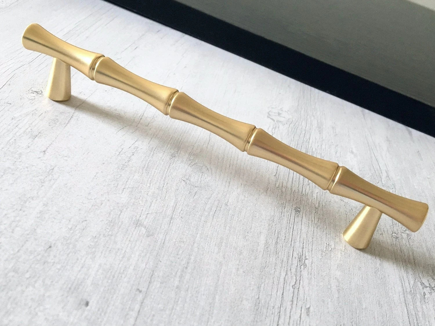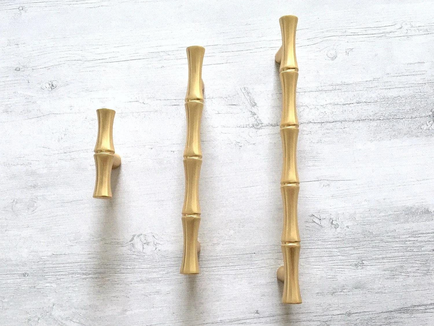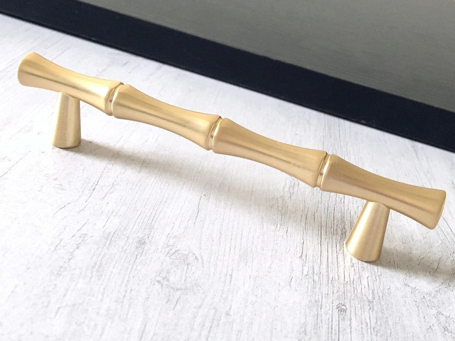 Diese Schubladengriffe aus satiniertem Bambusgold haben eine matte Oberfläche und sind in den Abmessungen 9,5 cm und 12,7 cm erhältlich. Ihr modernes Mid-Century-Design macht sie zur idealen Wahl, um Schränke und Küchen stilvoll und zeitlos aufzuwerten.