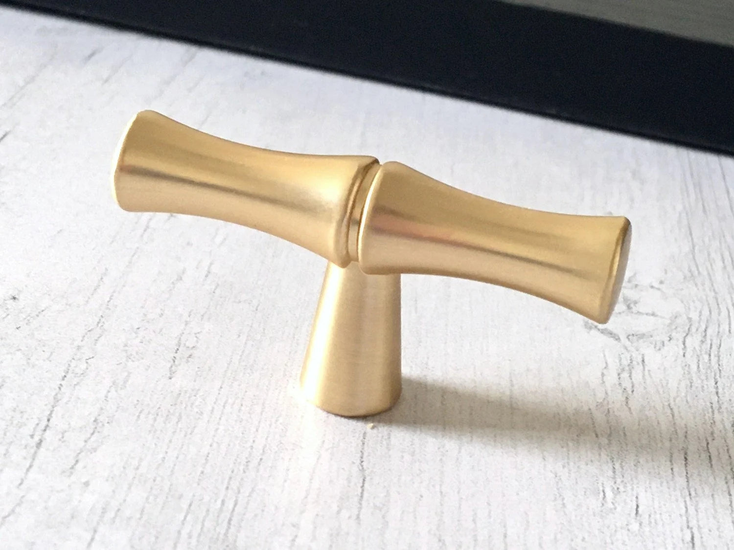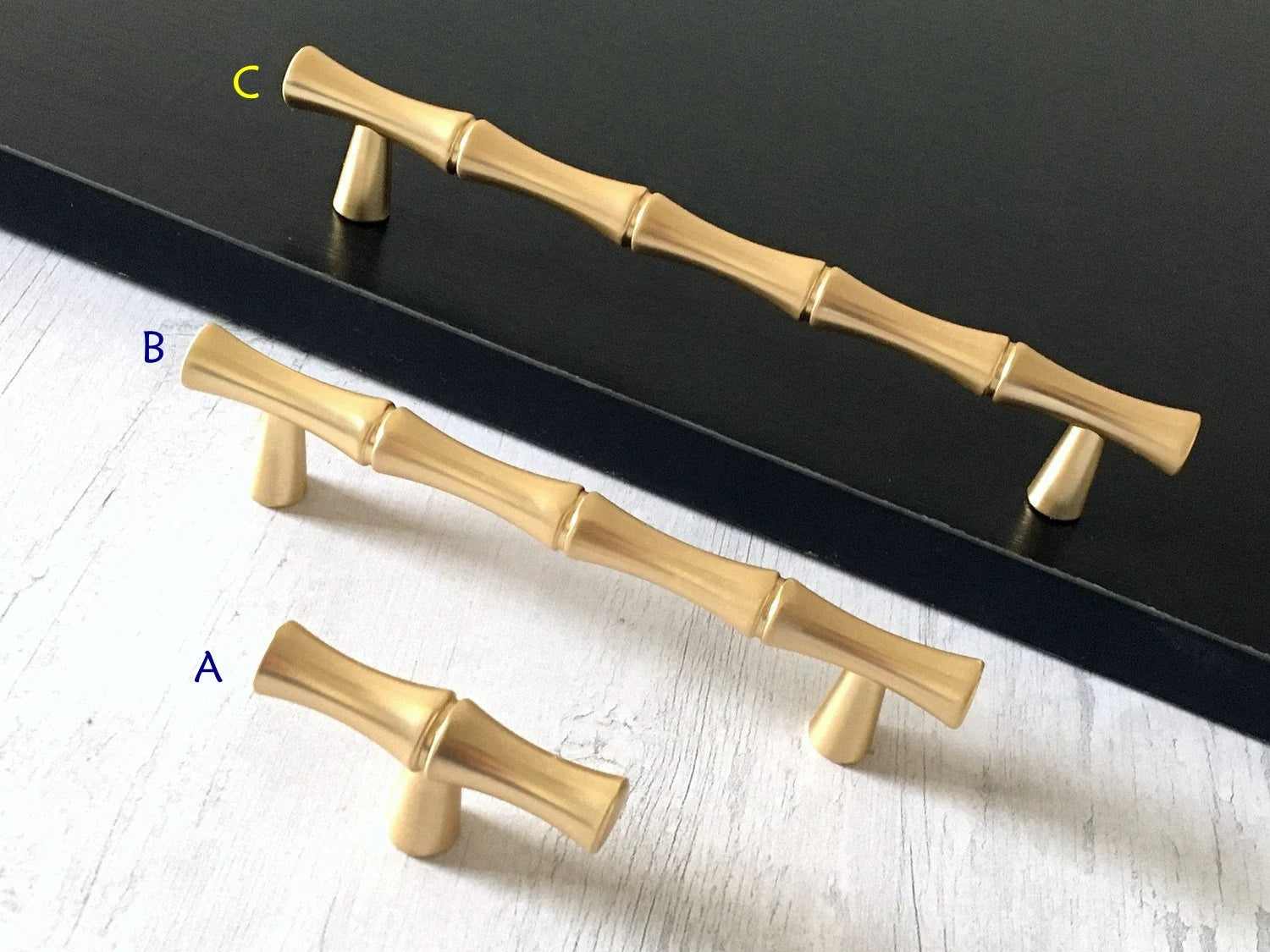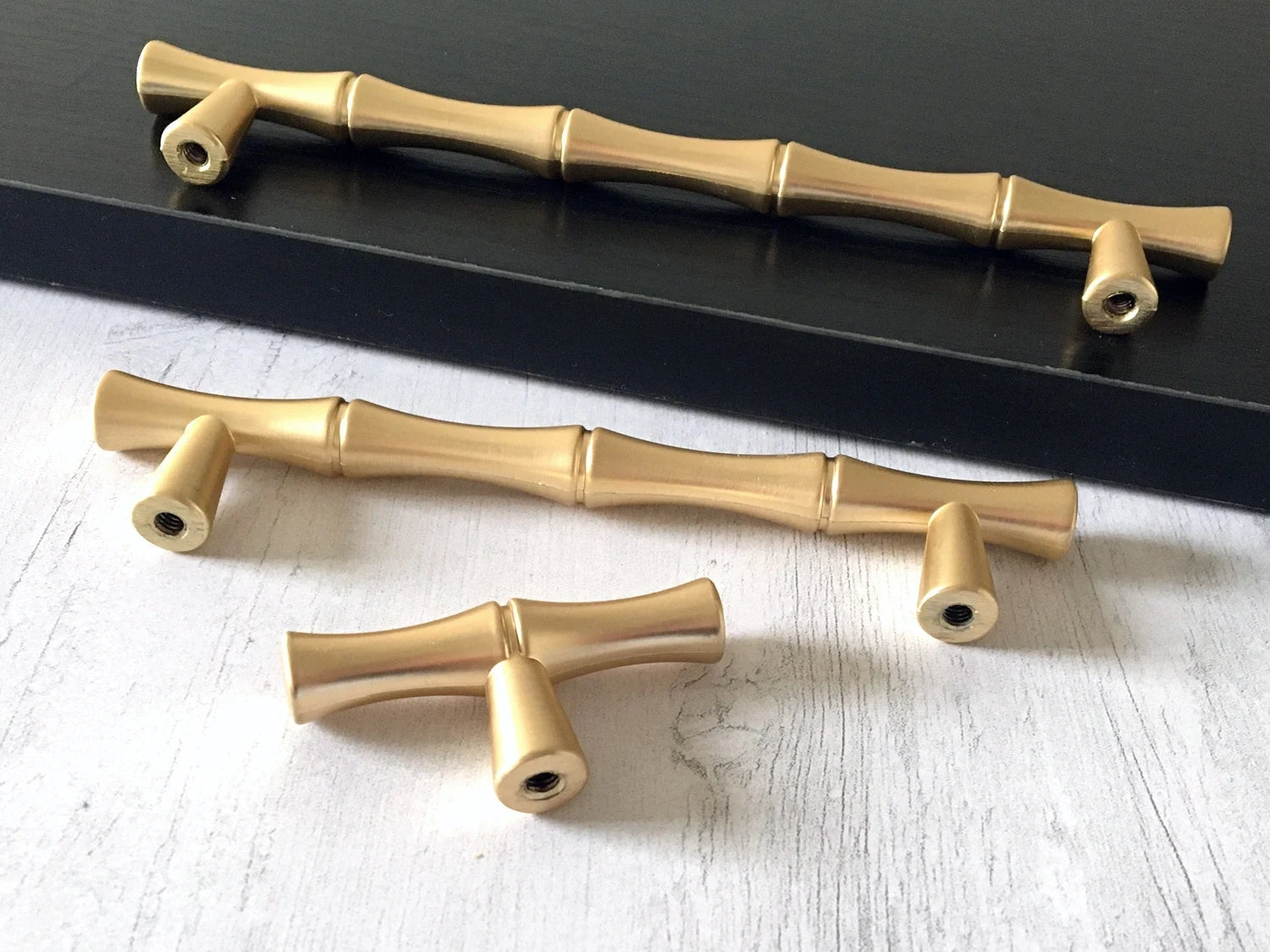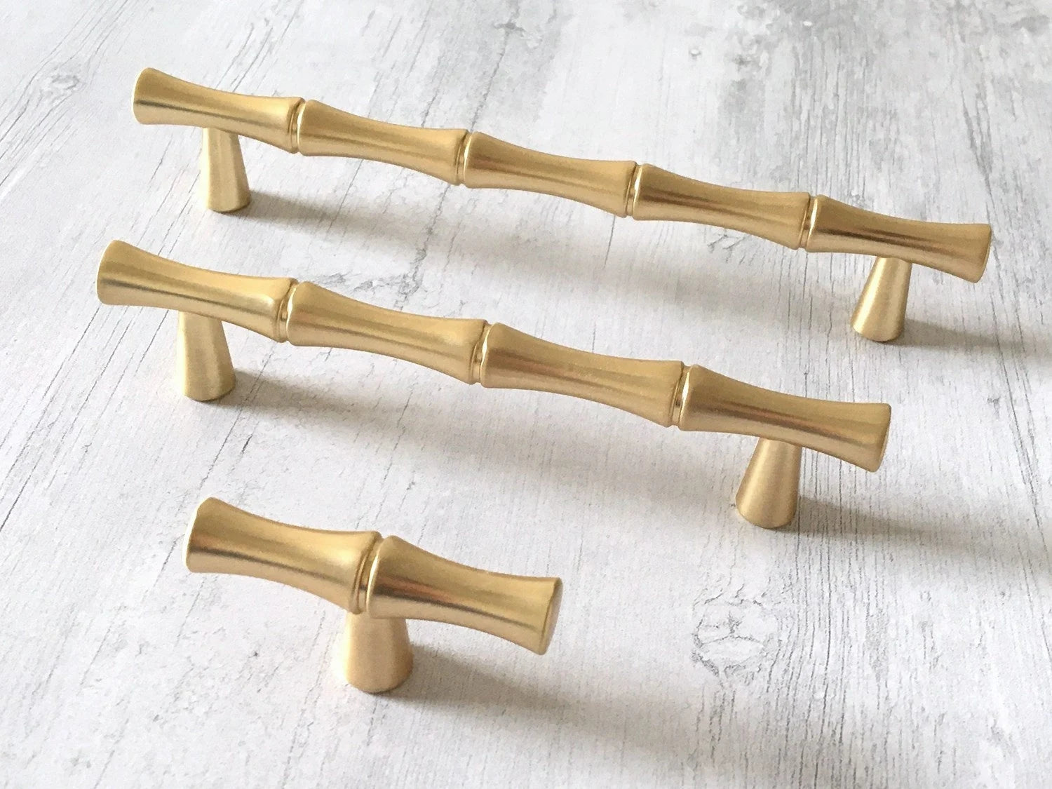 Diese Schubladengriffe aus satiniertem Bambusgold haben eine matte Oberfläche und sind in den Abmessungen 9,5 cm und 12,7 cm erhältlich. Ihr modernes Mid-Century-Design macht sie zur idealen Wahl, um Schränke und Küchen stilvoll und zeitlos aufzuwerten.