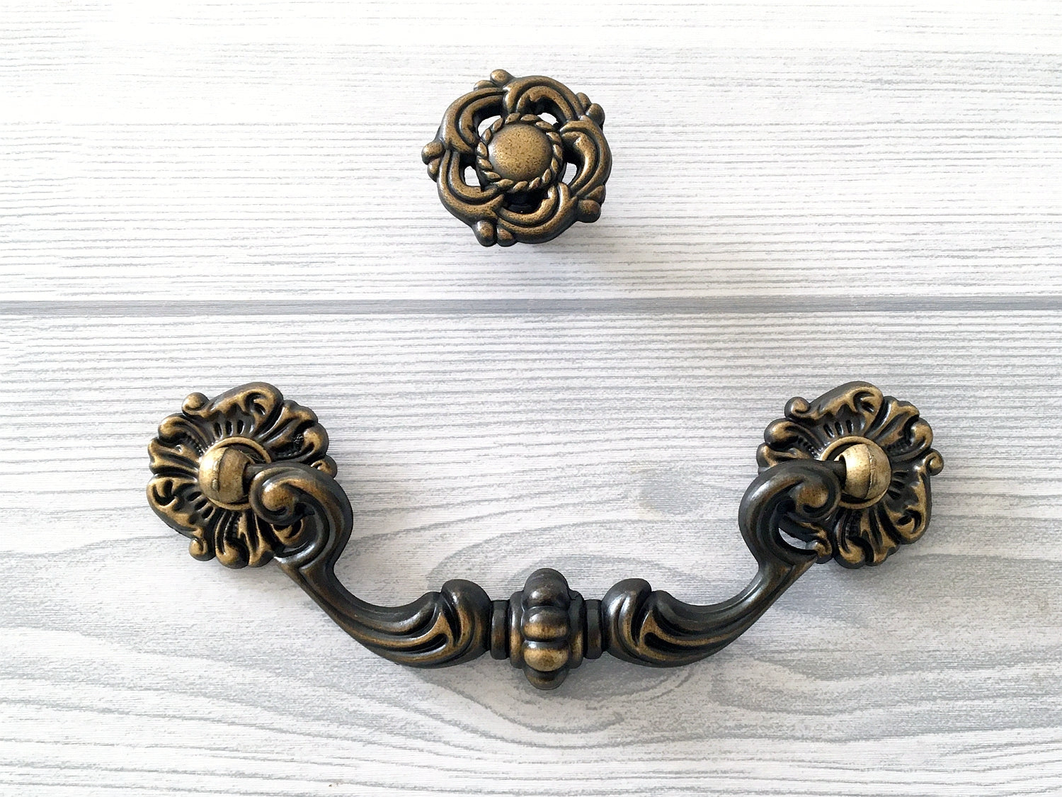 Enhance your furniture with this vintage style Bail Drawer Pull, featuring a rustic antique gold brass finish that adds timeless charm. The matching knob complements the pull, creating a cohesive and sophisticated look ideal for restoring or upgrading vintage and classic-style pieces.