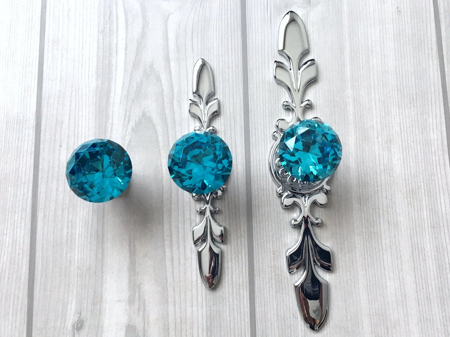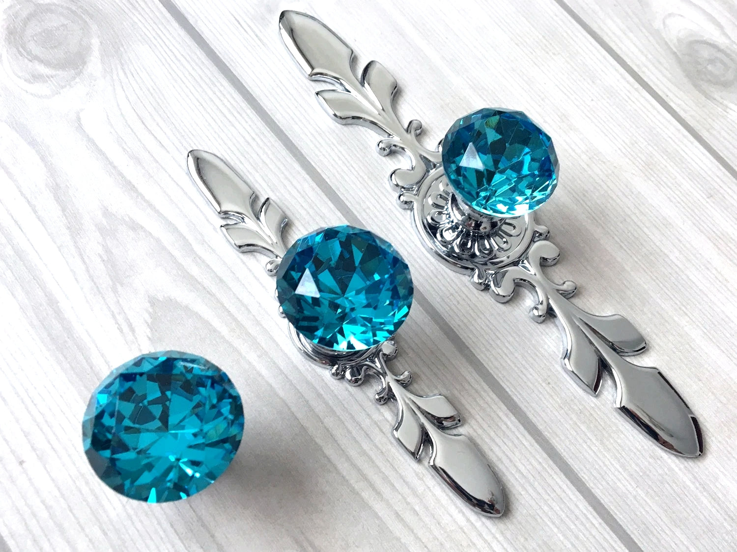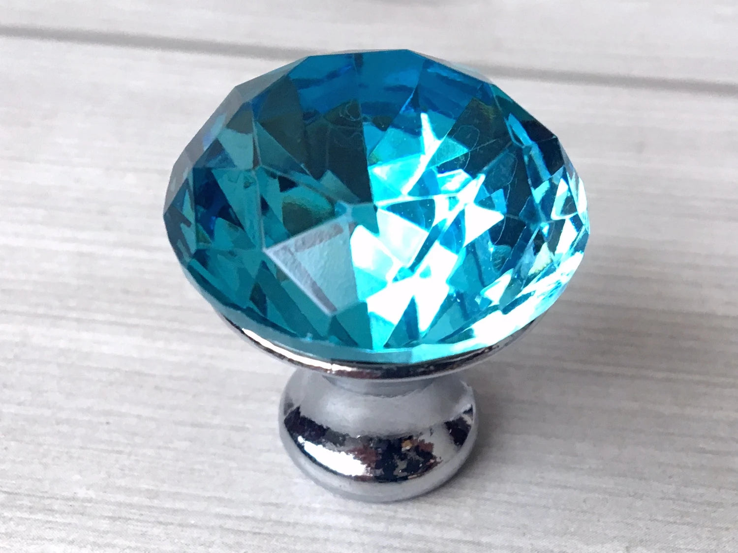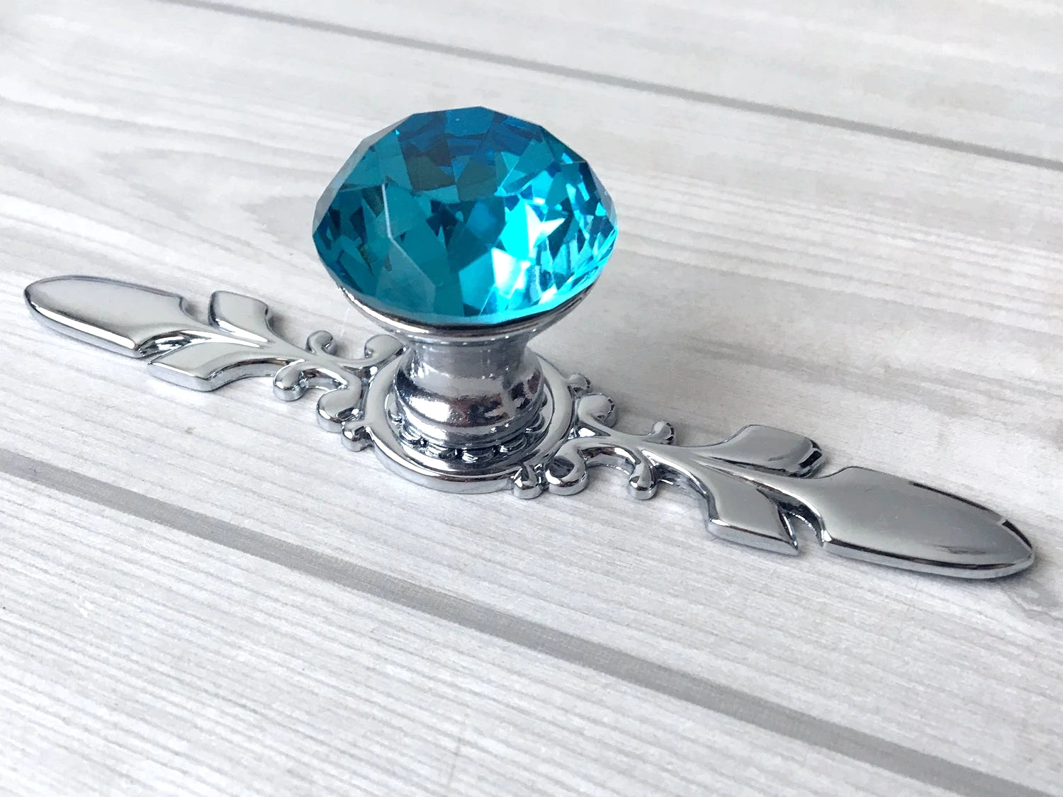 These Blue Glass Drawer Knobs with a polished chrome backplate combine durability with elegant design. The vibrant blue glass offers a striking focal point, while the polished chrome backplate ensures stability and a sleek, modern finish.