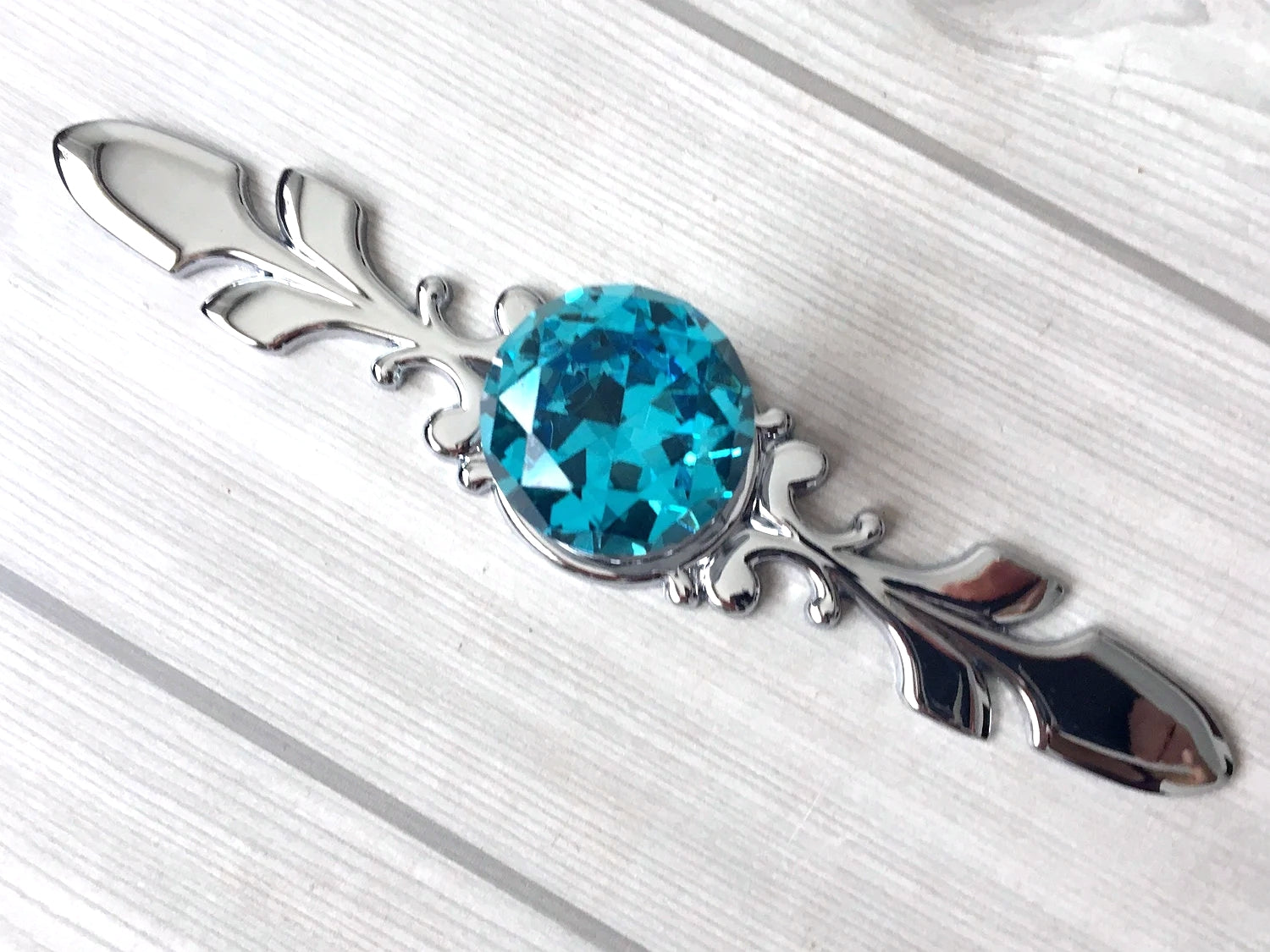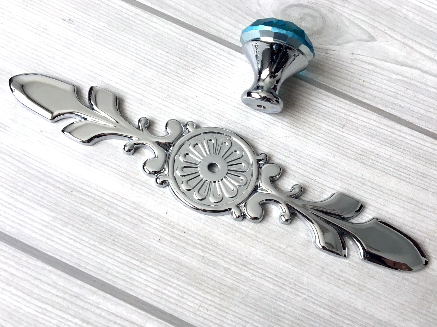 Blue Glass Drawer Knobs with Backplate, Polished Chrome