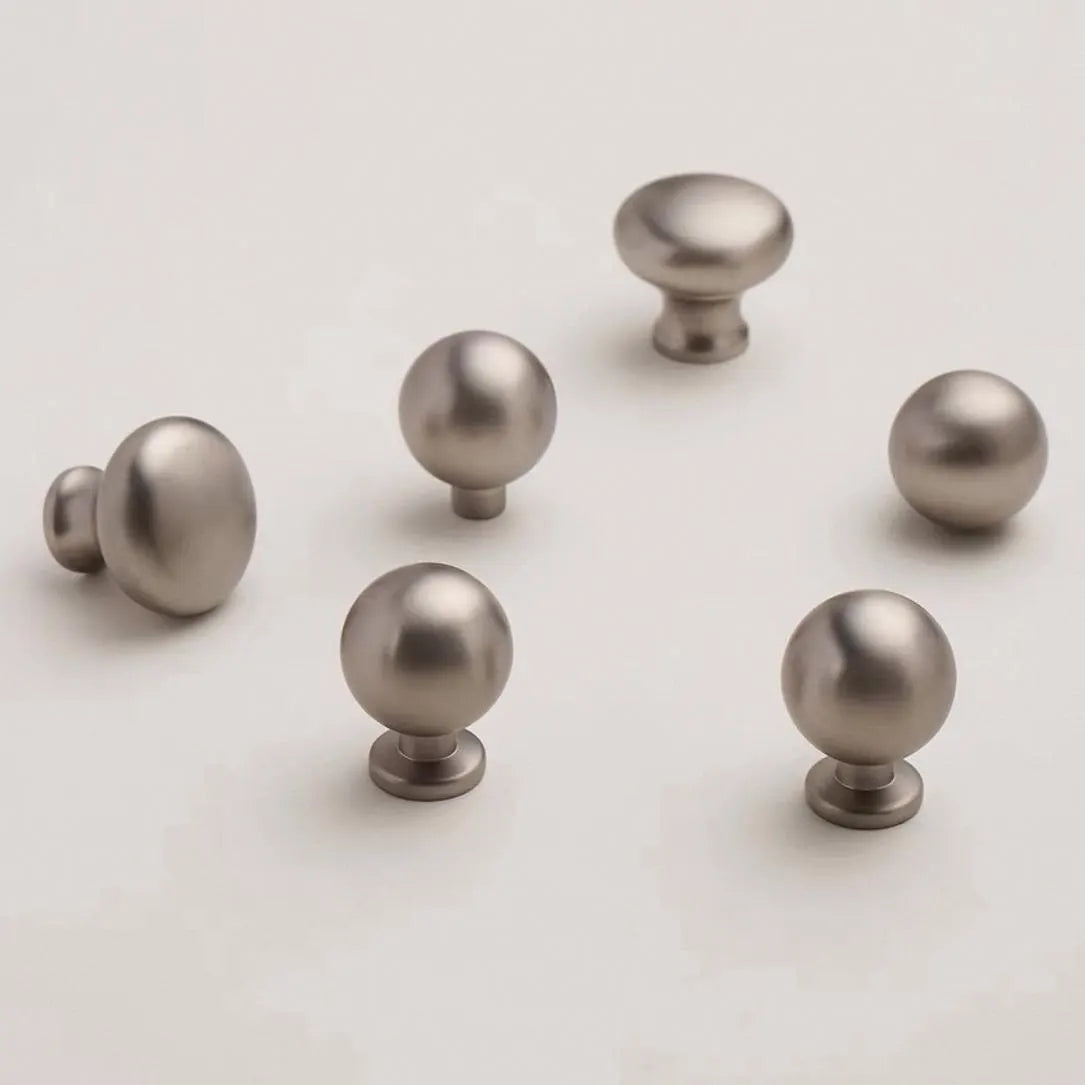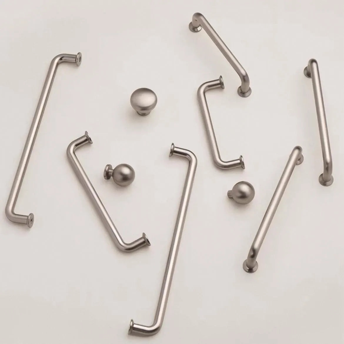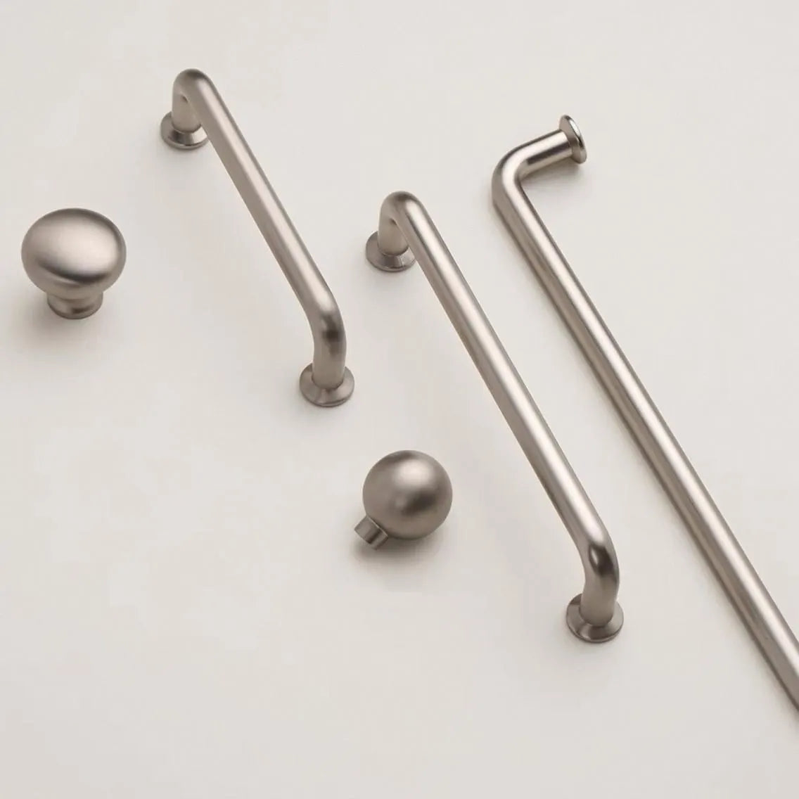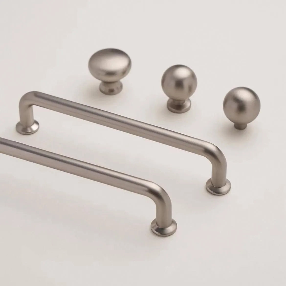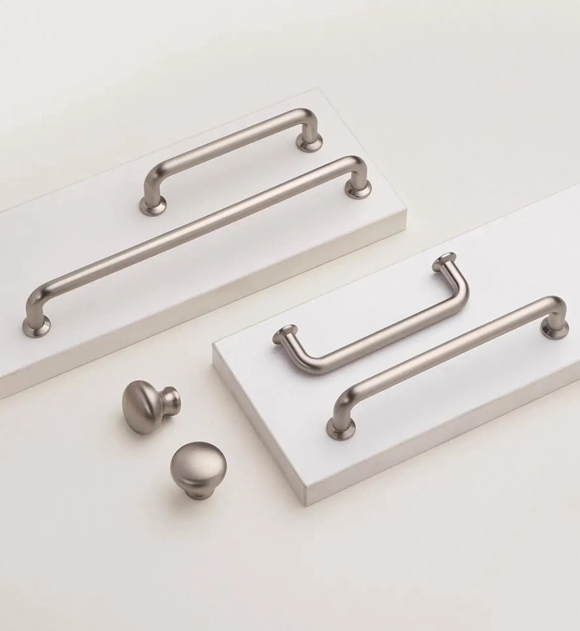 Enhance your cabinetry with these brushed nickel D handles and ball knobs, designed for a modern minimalist aesthetic. Available in 6.25", 5", and 7.5" center-to-center measurements, they offer versatile sizing to fit various cabinet layouts.
