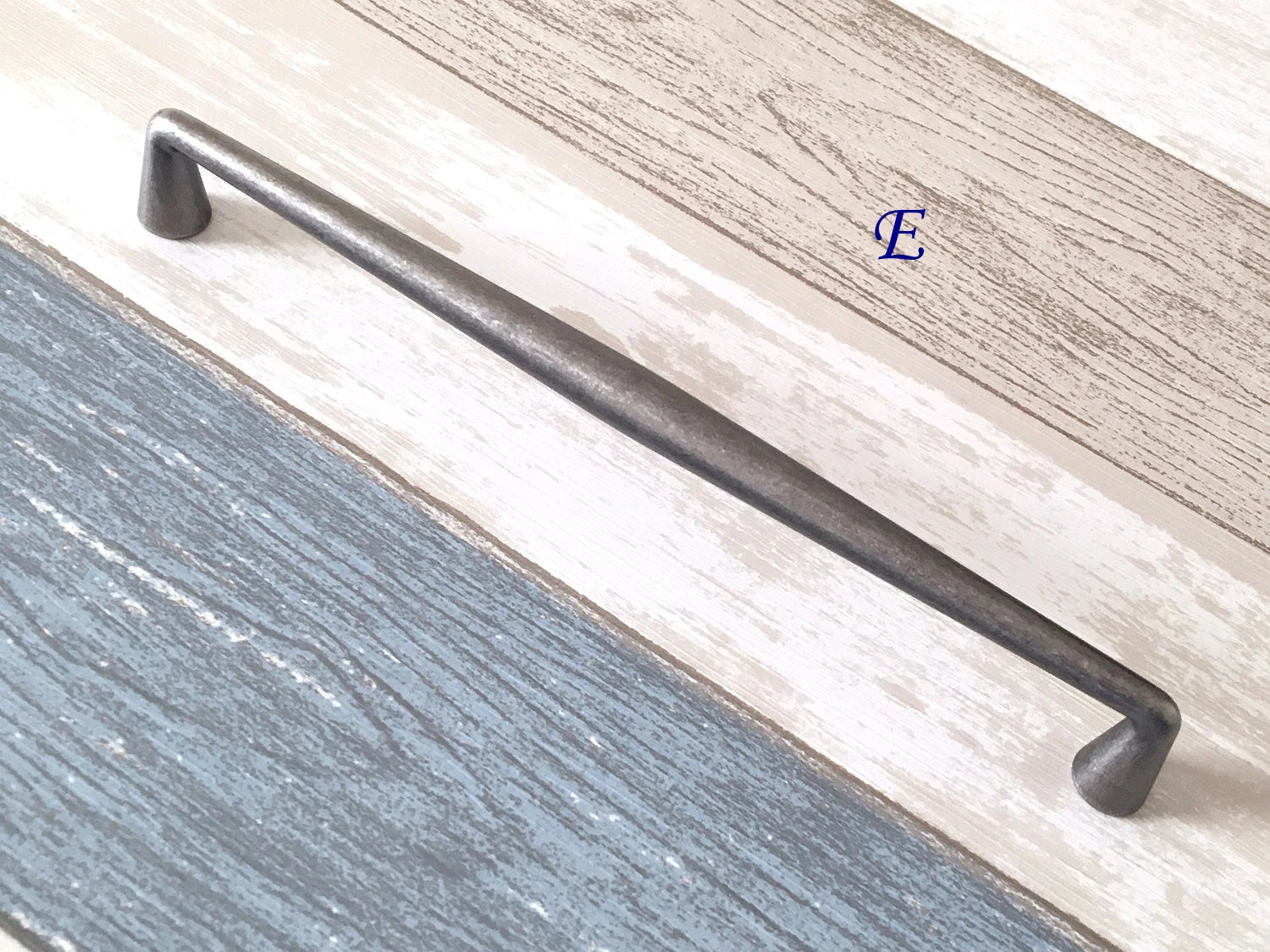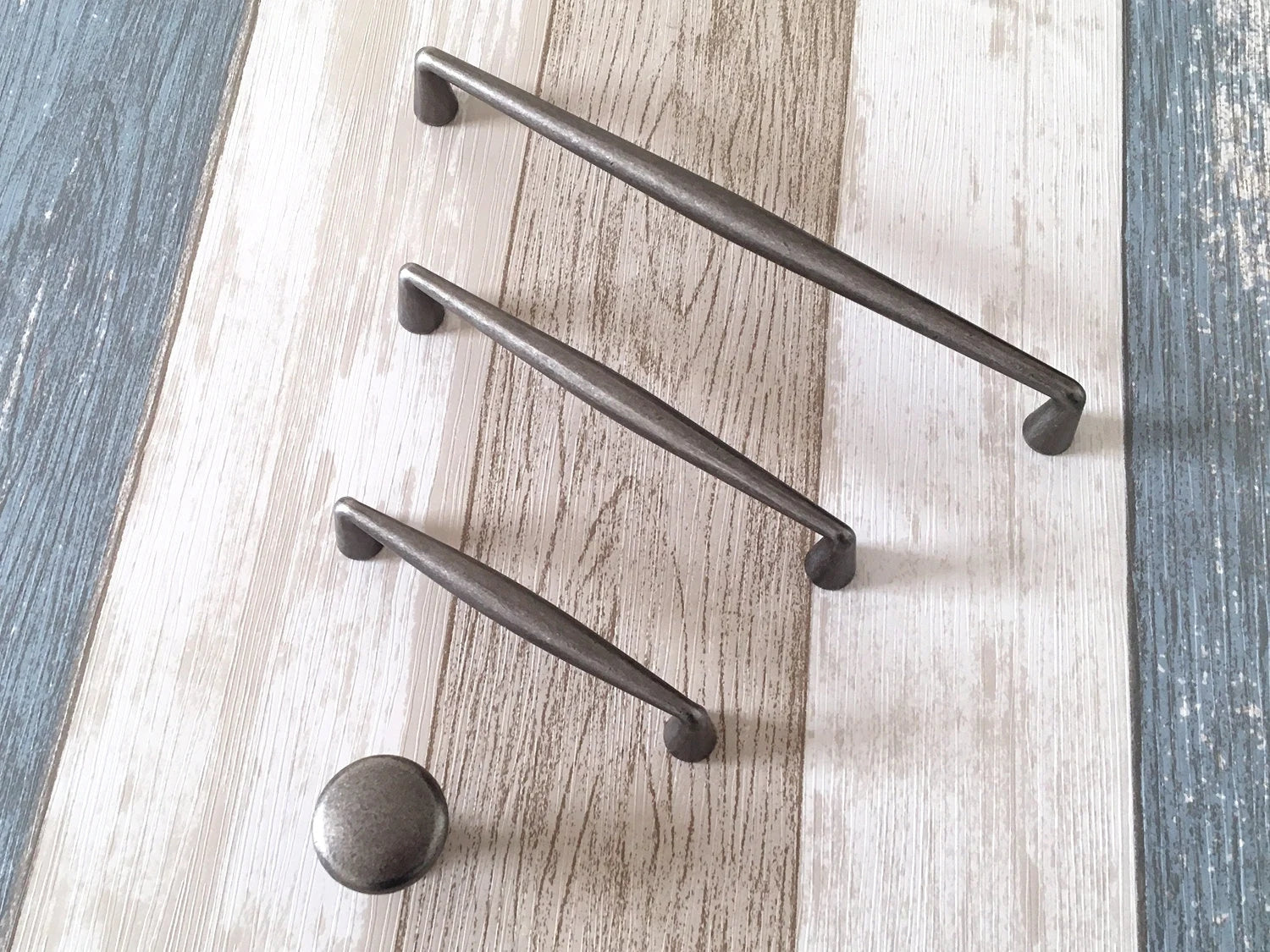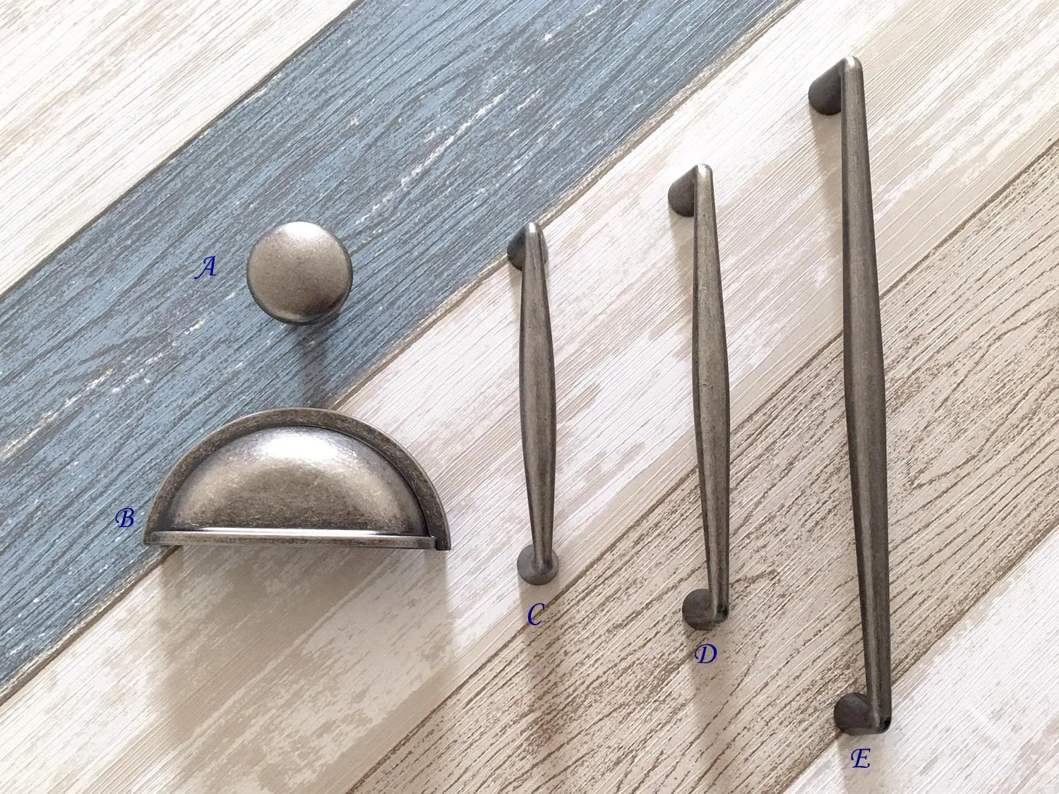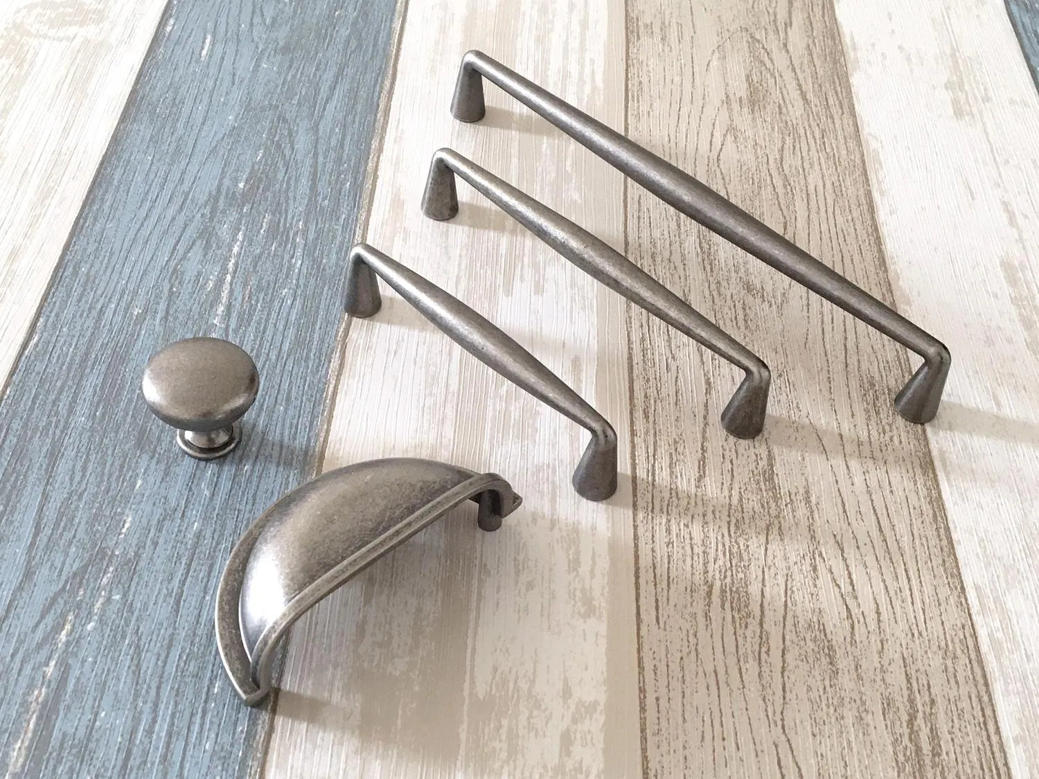 Diese antiken Schrankgriffe und -knöpfe aus Zinn zeichnen sich durch ihre solide Metallkonstruktion aus, die Langlebigkeit und Langlebigkeit gewährleistet. Ihr rustikales Retro-Design verleiht Ihren Küchengeräten zeitlosen Charme und passt perfekt zu traditionellen oder Vintage-Möbeln. Erhältlich in verschiedenen Größen mit Lochabständen von 76, 96, 128 und 192 mm bieten sie vielseitige Optionen für verschiedene Schubladen- und Schrankkonfigurationen. Diese Griffe vereinen Robustheit mit klassischer Ästhetik und bieten sowohl funktionale Zuverlässigkeit als auch ein elegantes, gealtertes Zinn-Finish.