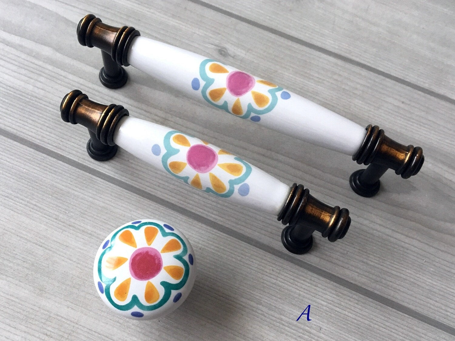 Enhance your cabinetry with these colorful porcelain drawer pulls, designed with 3.75" and 5" center measurements for versatile fit. Featuring four distinct designs, each pull combines durable porcelain construction with vibrant patterns to add a refined and unique touch to your furniture. Perfect for updating drawers, cabinets, or dressers, these pulls deliver both aesthetic appeal and reliable functionality.