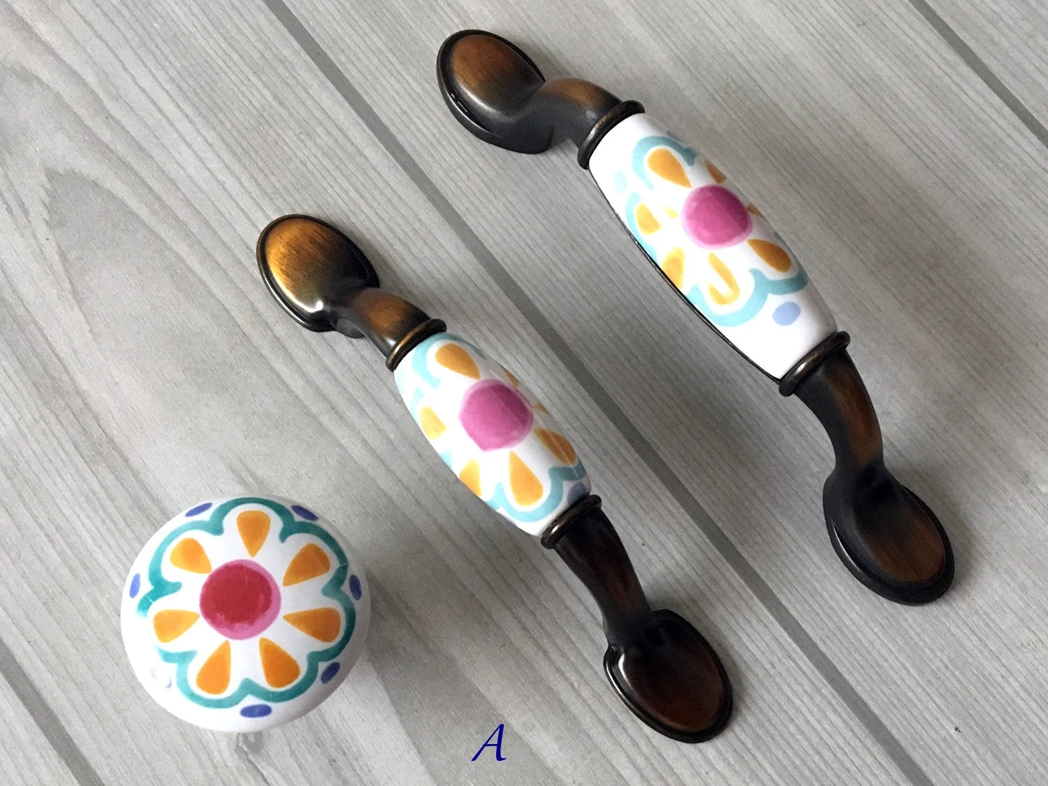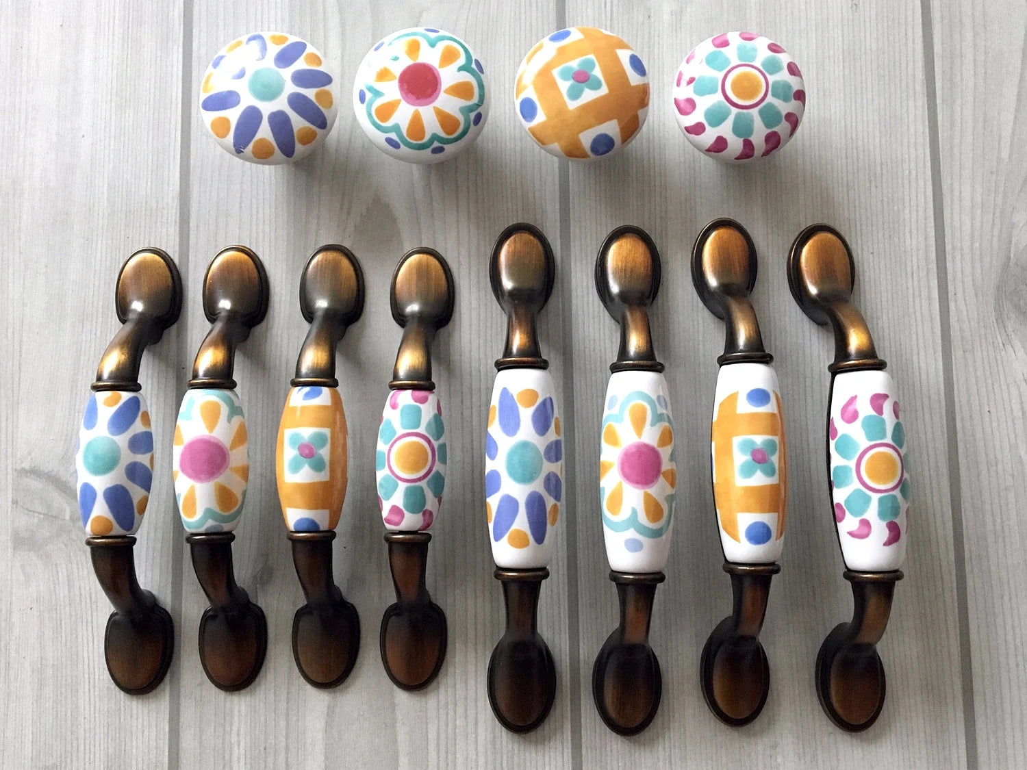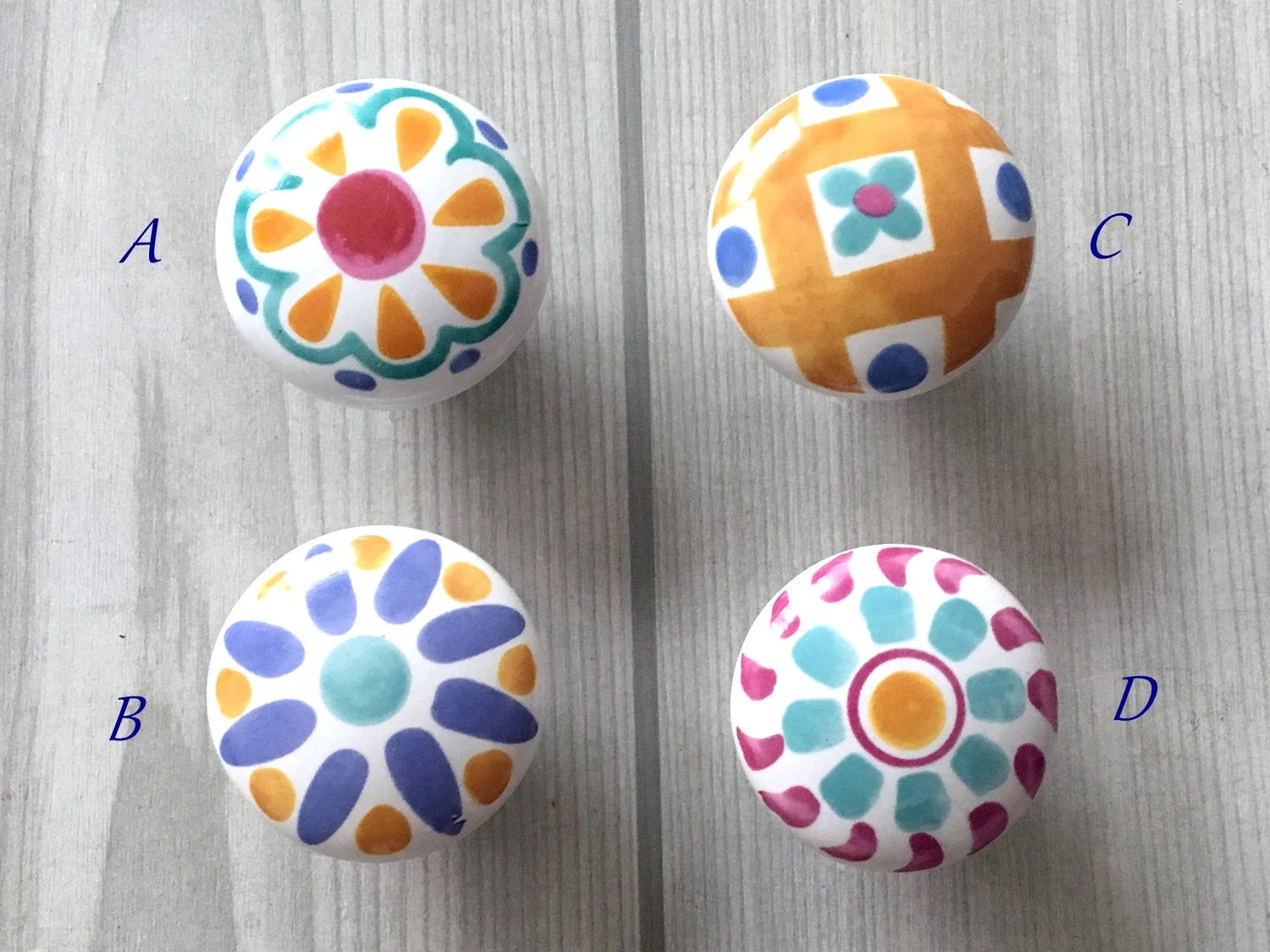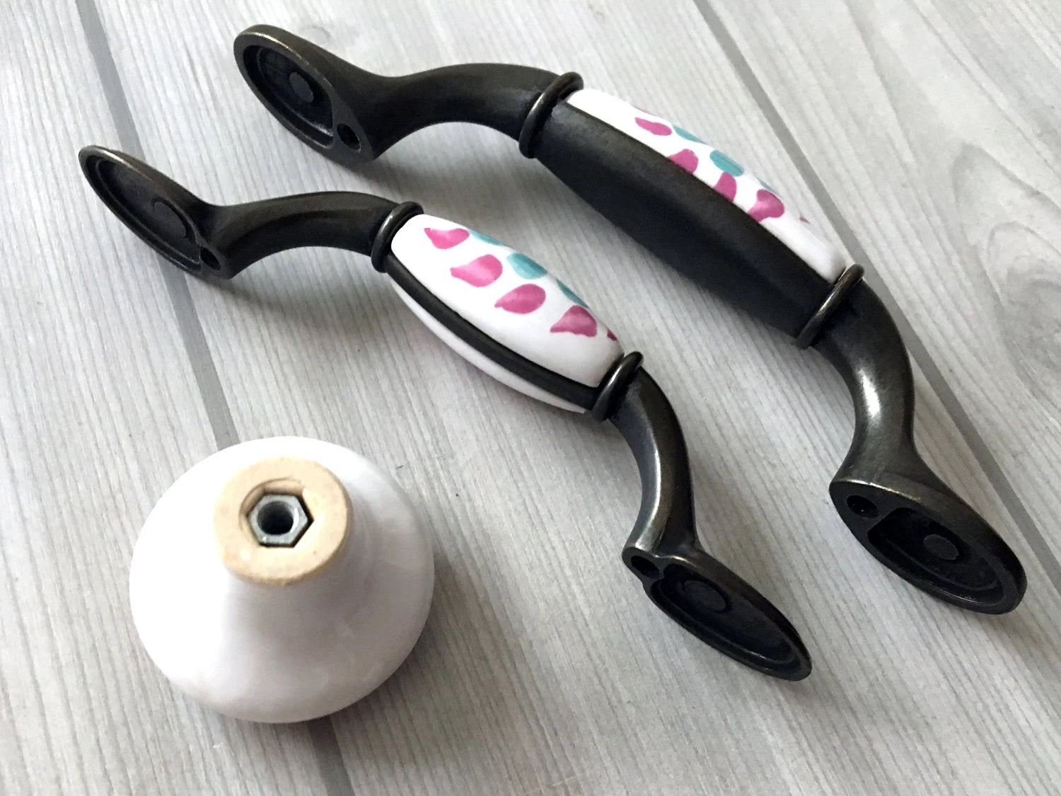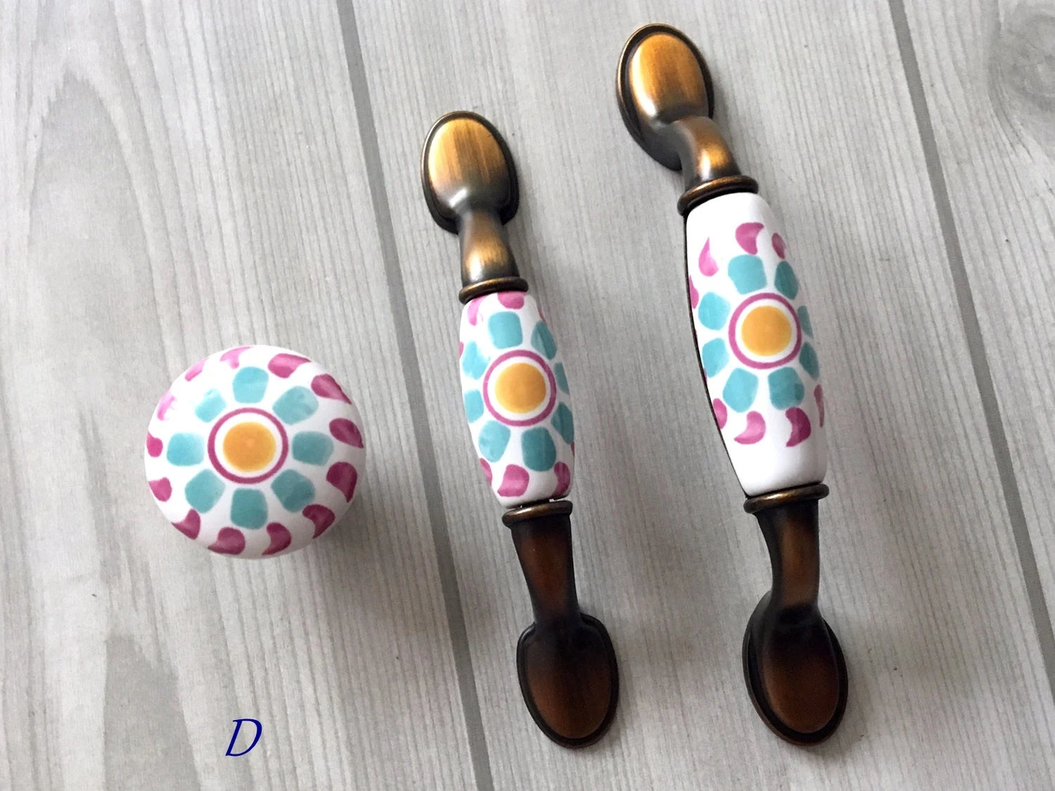 Enhance your cabinetry with these colorful porcelain drawer pulls, designed with 3" and 3.75" center measurements for versatile fit. Featuring four distinct designs, each pull combines durable porcelain construction with vibrant patterns to add a refined and unique touch to your furniture. Perfect for updating drawers, cabinets, or dressers, these pulls deliver both aesthetic appeal and reliable functionality.