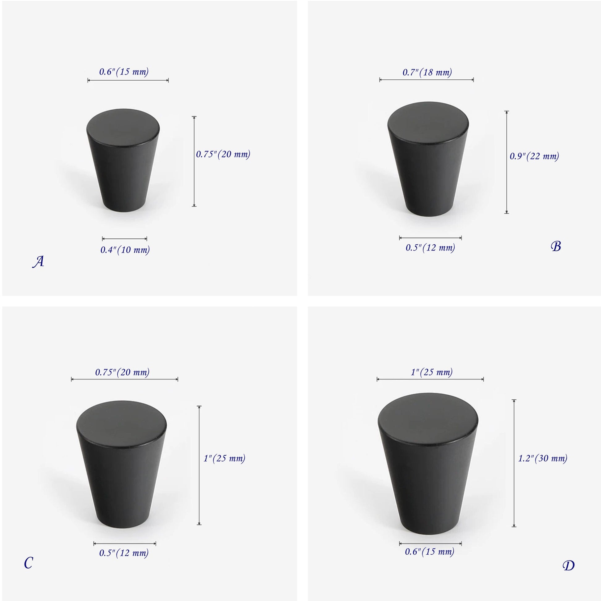 Elevate your cabinetry with these tapered brass knobs featuring a sleek cone design. Crafted in matte black, antique bronze and brushed gold finishes, they provide both strength and timeless style.