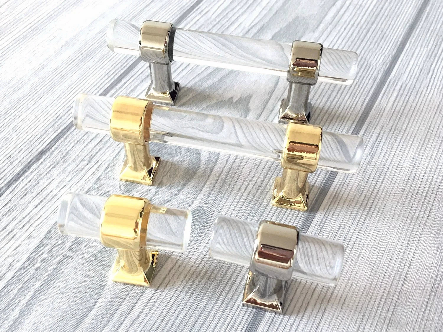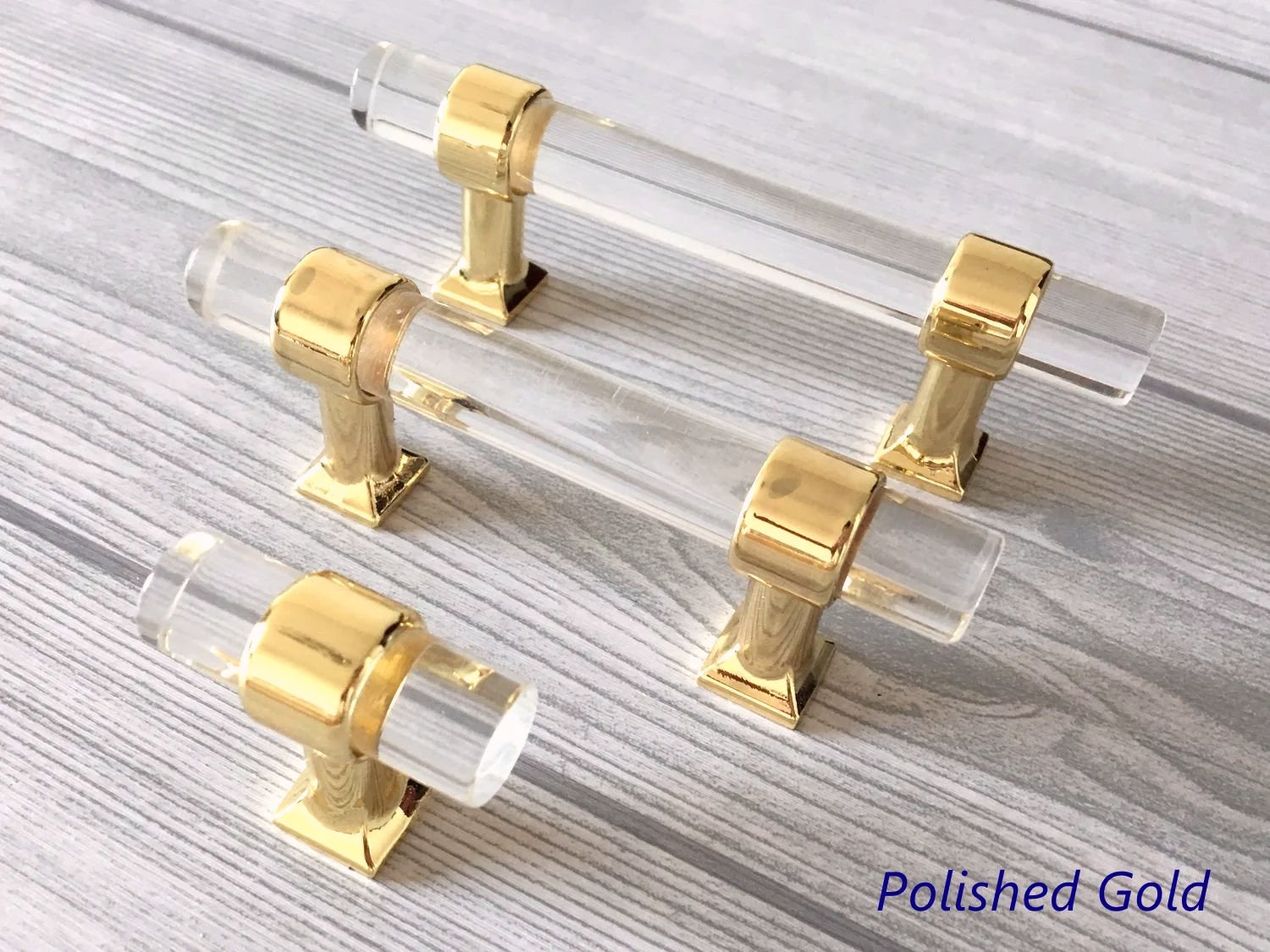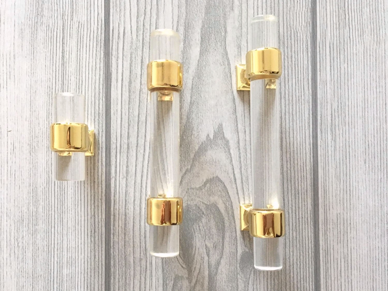 Poignées de tiroir en Lucite, acrylique, laiton doré brossé | Lynns Hardware | Entraxes : 5, 6,35 et 8,35 cm