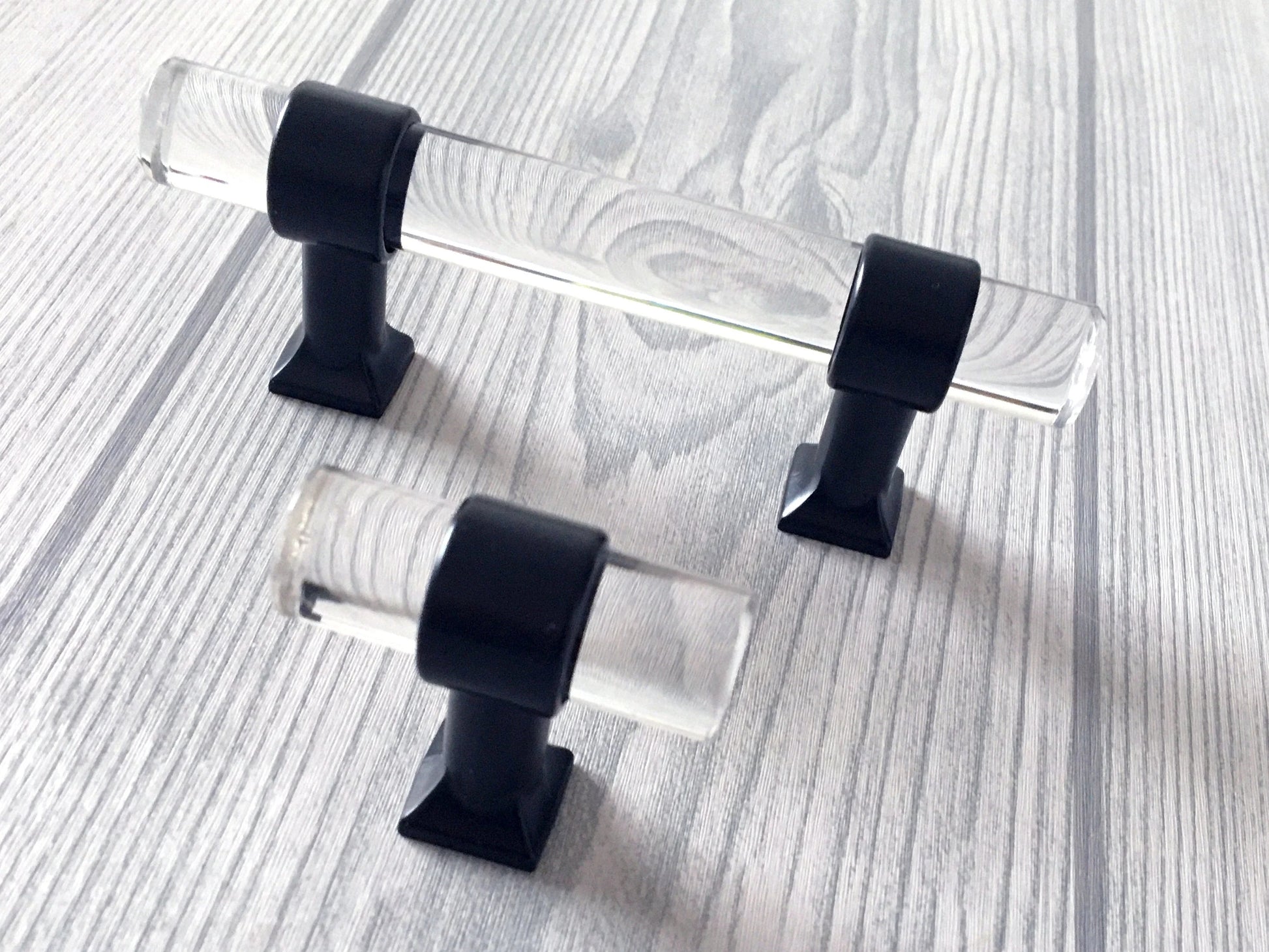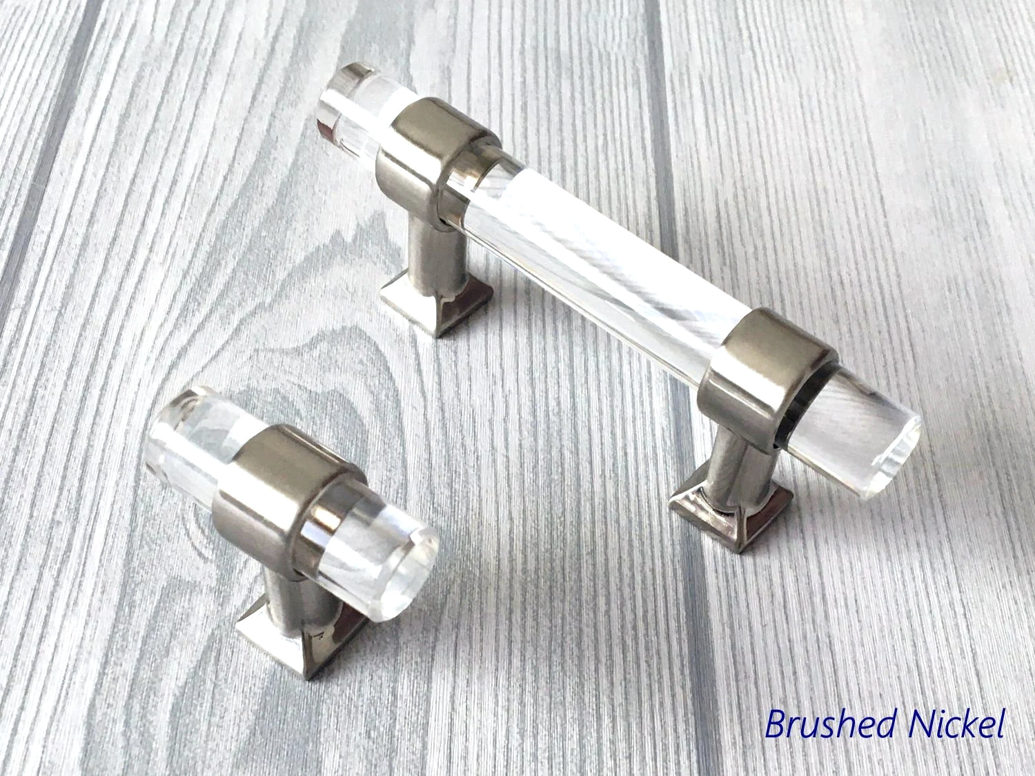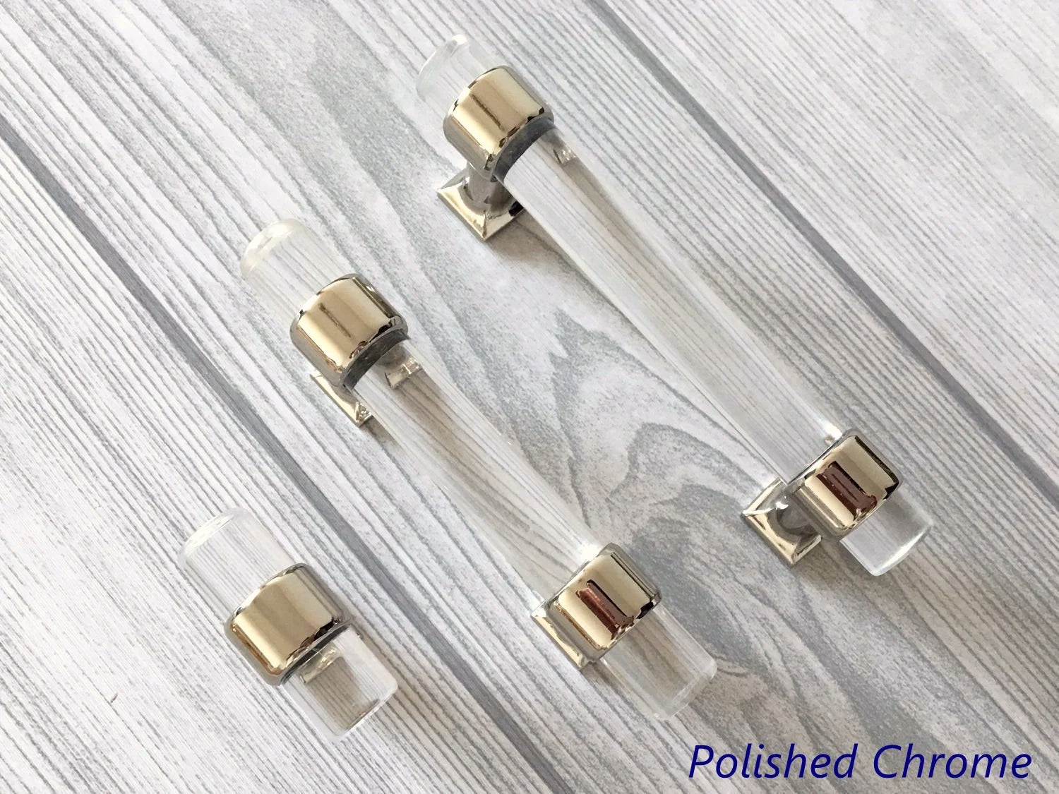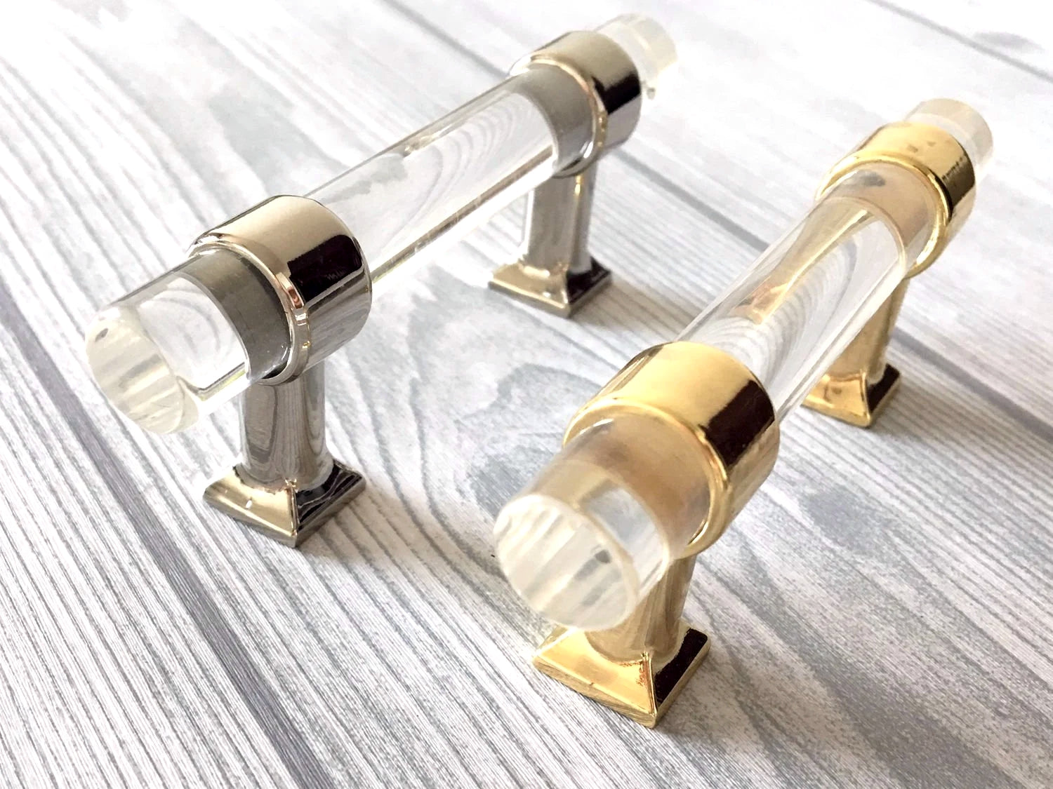Poignées de tiroir en Lucite, acrylique, laiton doré brossé | Lynns Hardware | Entraxes : 5, 6,35 et 8,35 cm