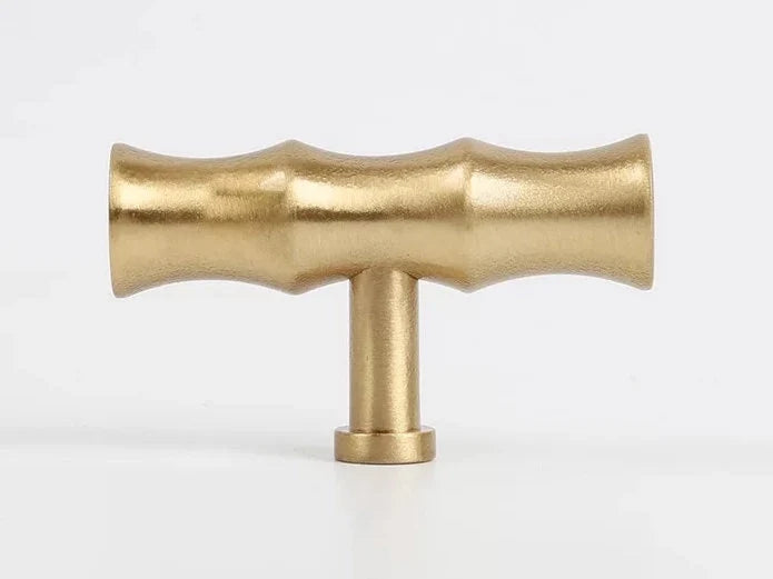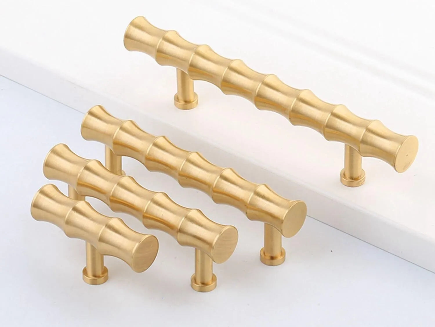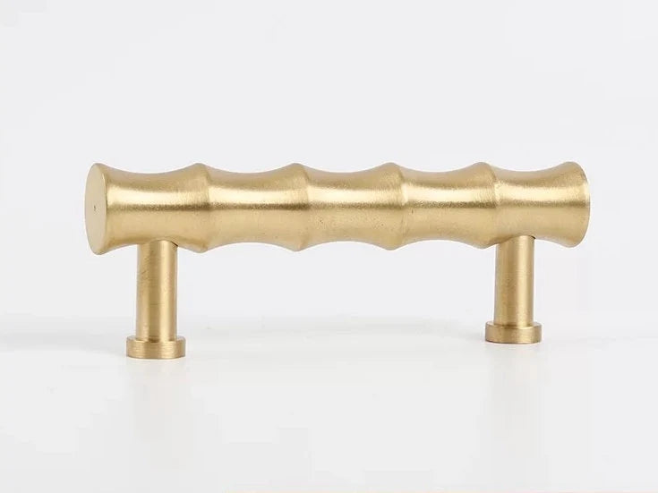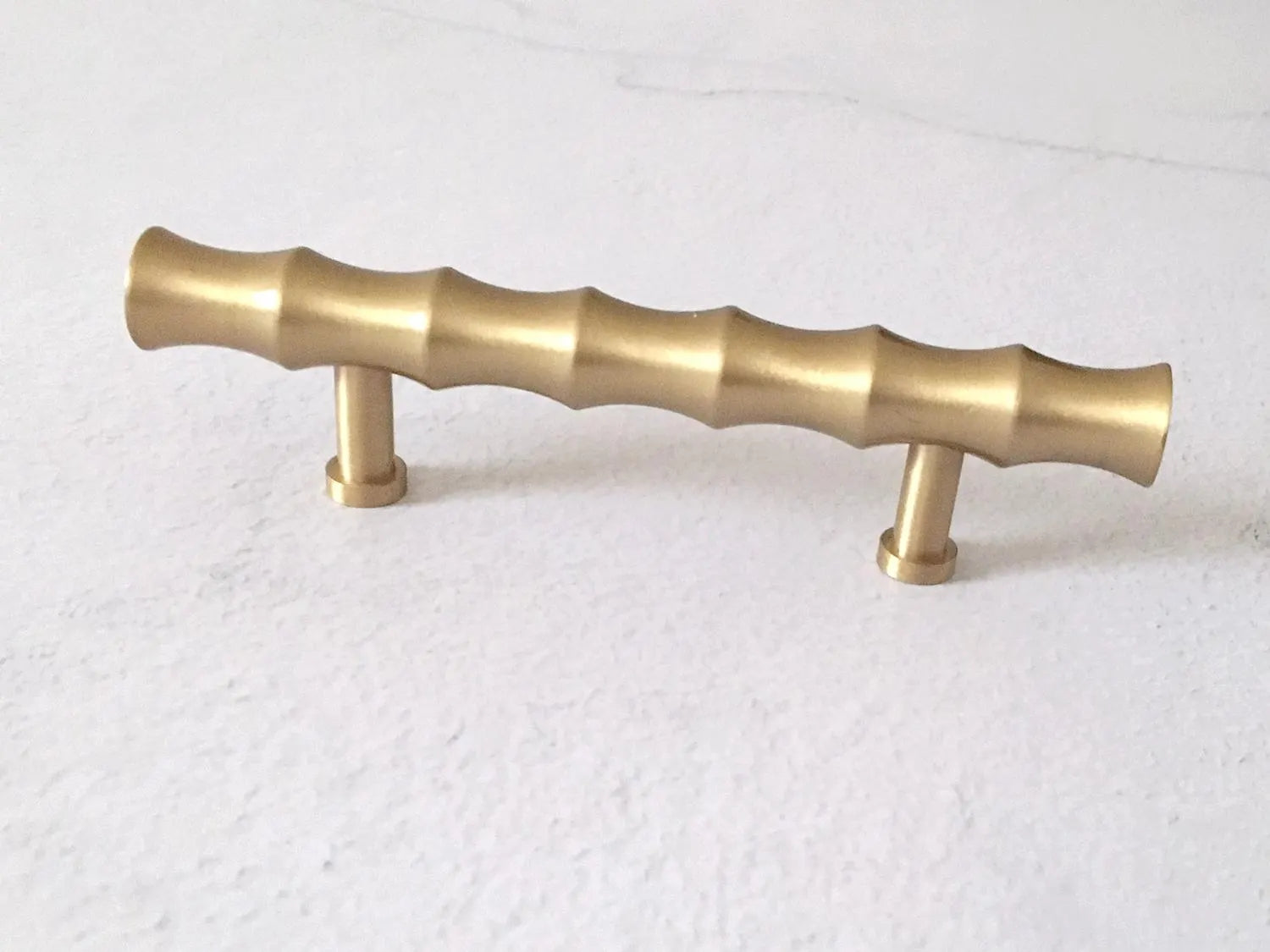 Ces poignées d'armoire en laiton massif arborent un design distinctif inspiré du bambou et sont disponibles en quatre tailles : 6,35 cm, 70 cm, 7,5 cm et 8,4 cm. Leur esthétique moderne du milieu du siècle offre une touche d'originalité à vos tiroirs, alliant durabilité et style intemporel. Idéales pour remplacer la quincaillerie existante, ces poignées allient fonctionnalité et raffinement pour sublimer vos meubles.