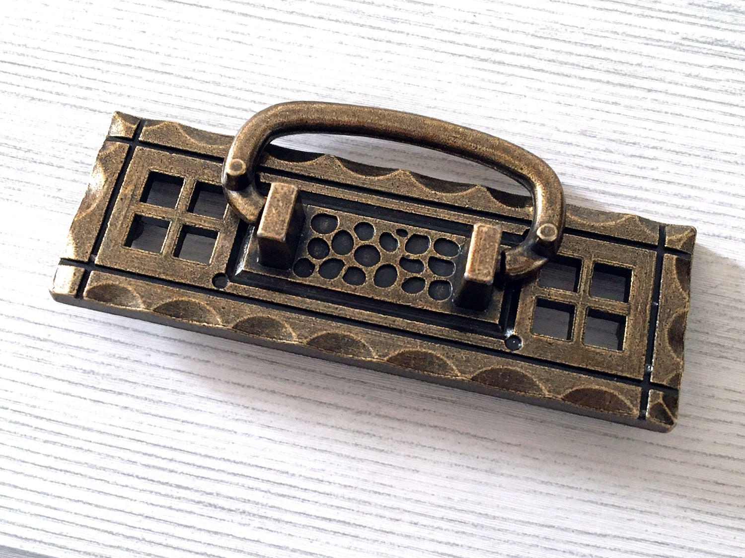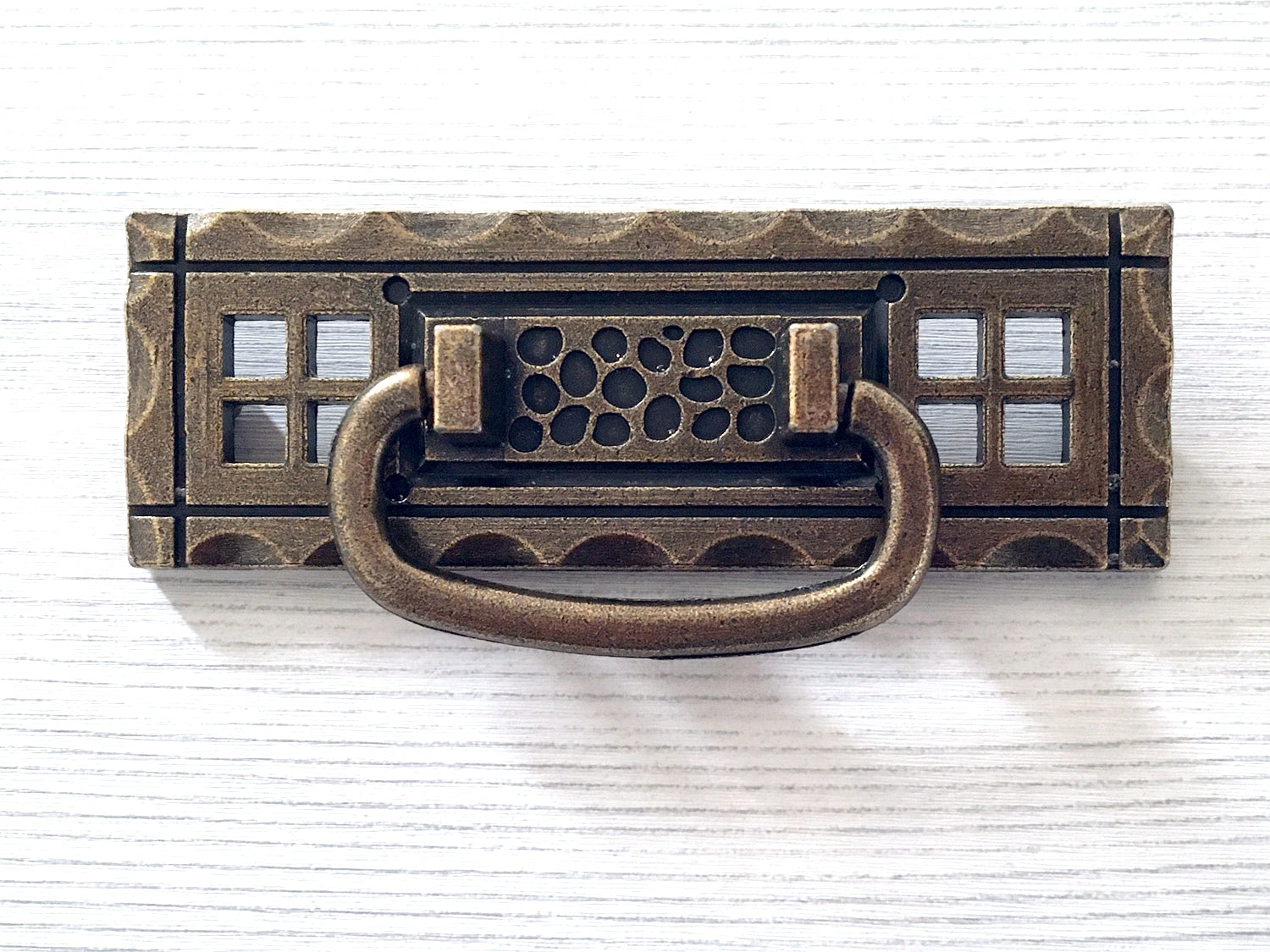 This 3.25" Antique Bronze Drop Bail Drawer Pull features a vintage design with a rectangular backplate adorned by intricate pierced artwork reminiscent of classic window patterns. Crafted to blend functionality with timeless style, it offers a secure grip while enhancing the character of drawers and cabinets. The antique bronze finish ensures durability and a distinctive aged appearance, perfect for restoring or upgrading traditional furniture pieces with authentic detail.