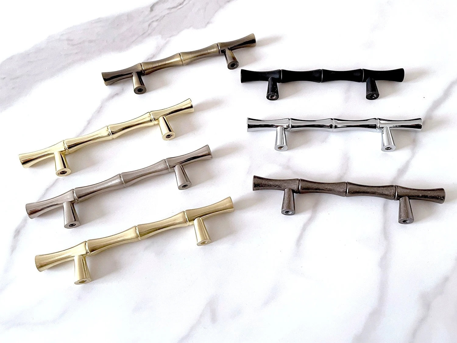 These 3-inch centers bamboo-shaped cabinet pull handles combine aesthetic appeal with precise function.. Crafted to enhance kitchen cabinetry, their bamboo design offers a stylish touch while providing a comfortable grip for everyday use.