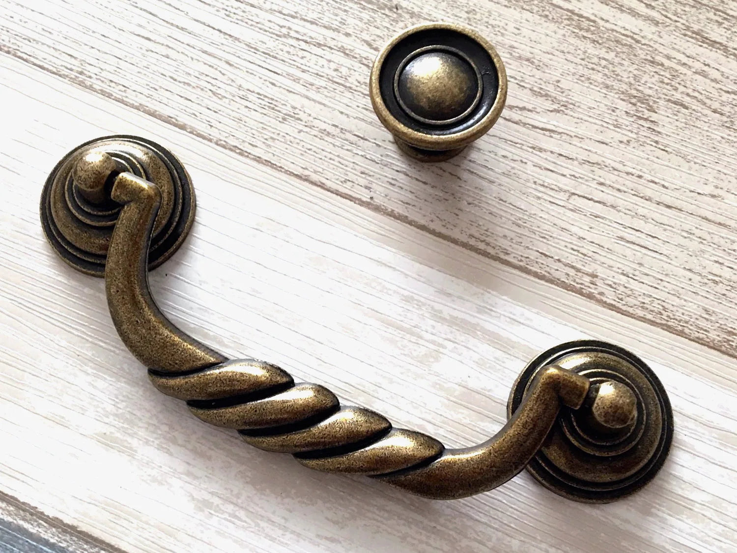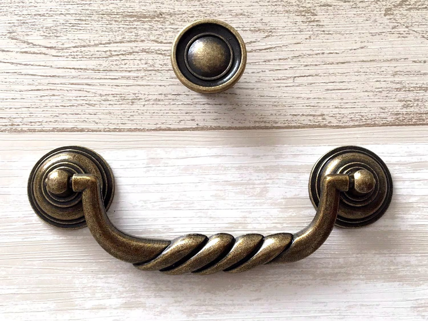 These 4 1/2" bail drawer pull handles feature an antique bronze finish that adds a timeless, elegant touch to your furniture. Designed with 4.5-inch centers, they provide a comfortable grip and easy installation. Ideal for restoring or upgrading drawers, these drop handles combine classic style with durable construction for lasting performance.