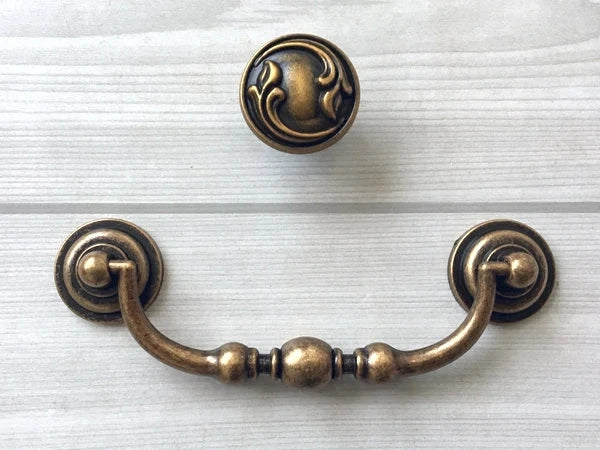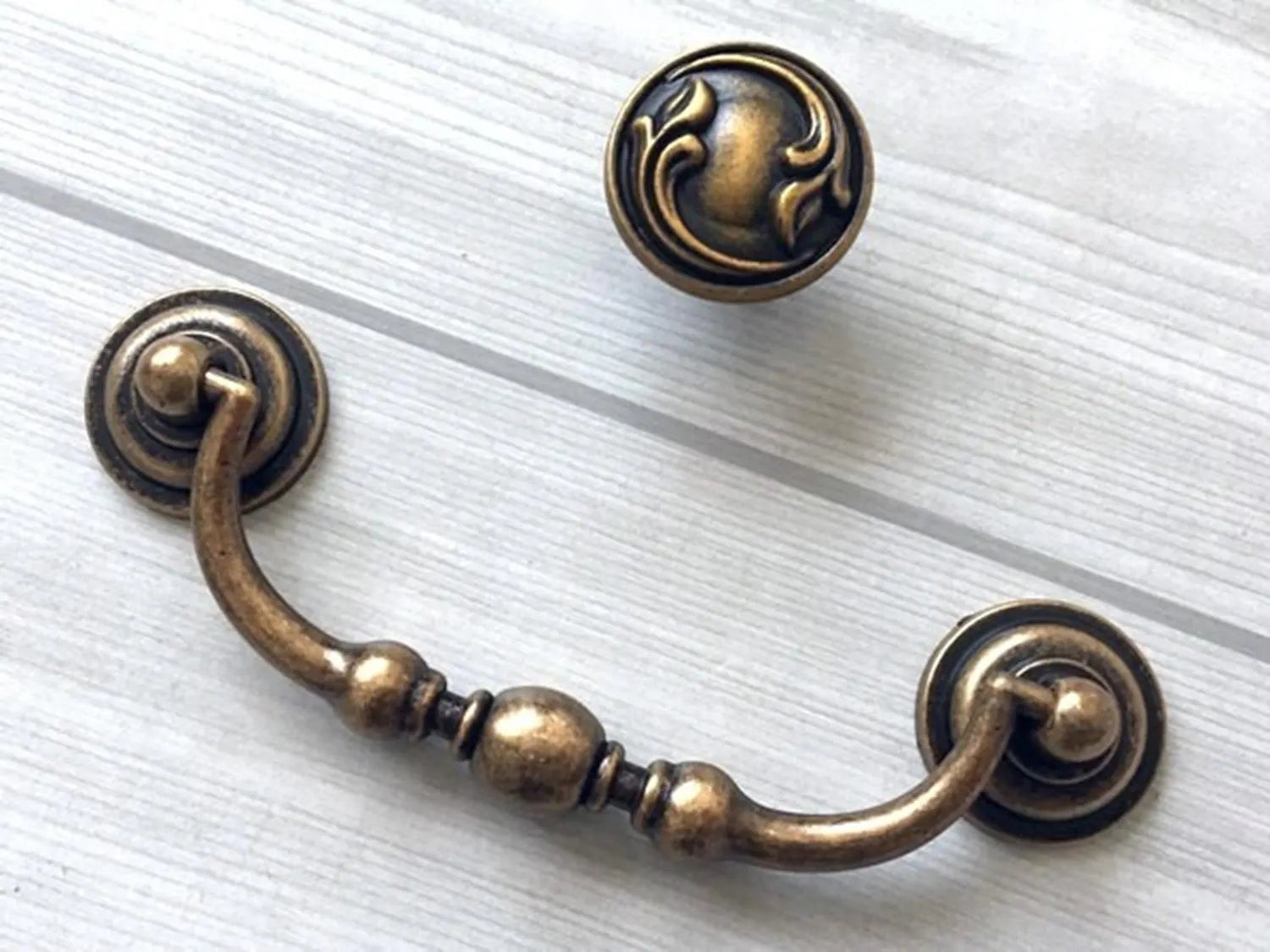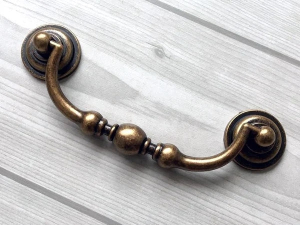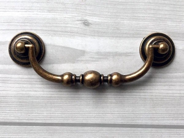 These 4.25" drawer pull bail drop handles in antique brass offer a vintage aesthetic perfect for restoring or upgrading furniture. With a precise 4 1/4" center-to-center measurement, they fit hard-to-find sizes, making them ideal replacements for older hardware. Crafted for size and style, these handles combine classic design with practical functionality.