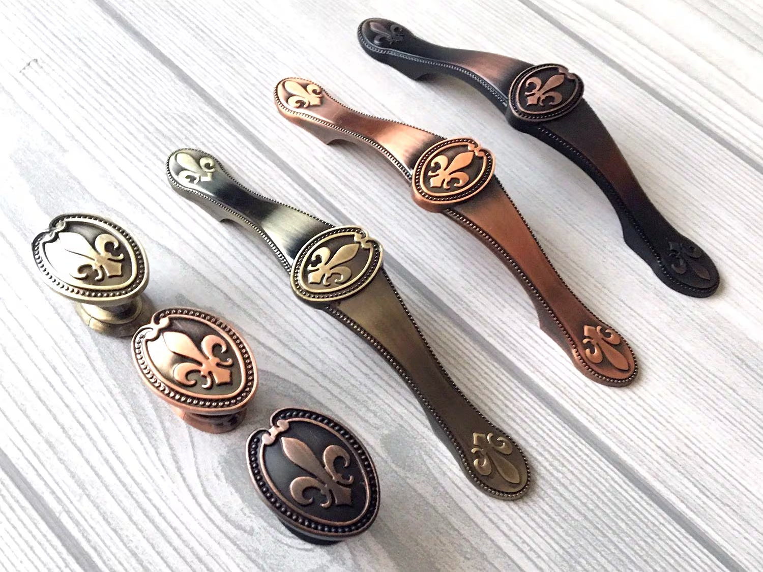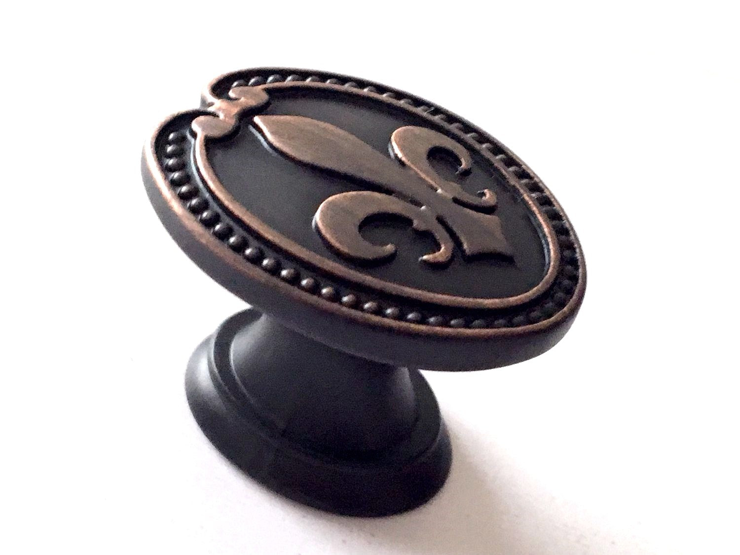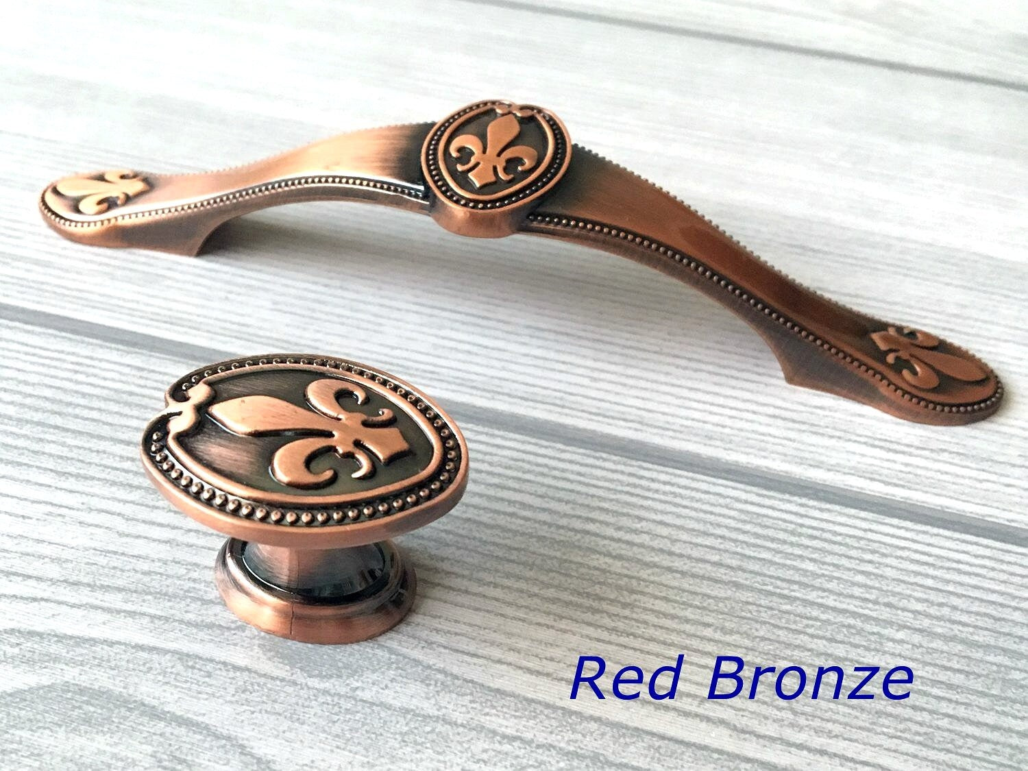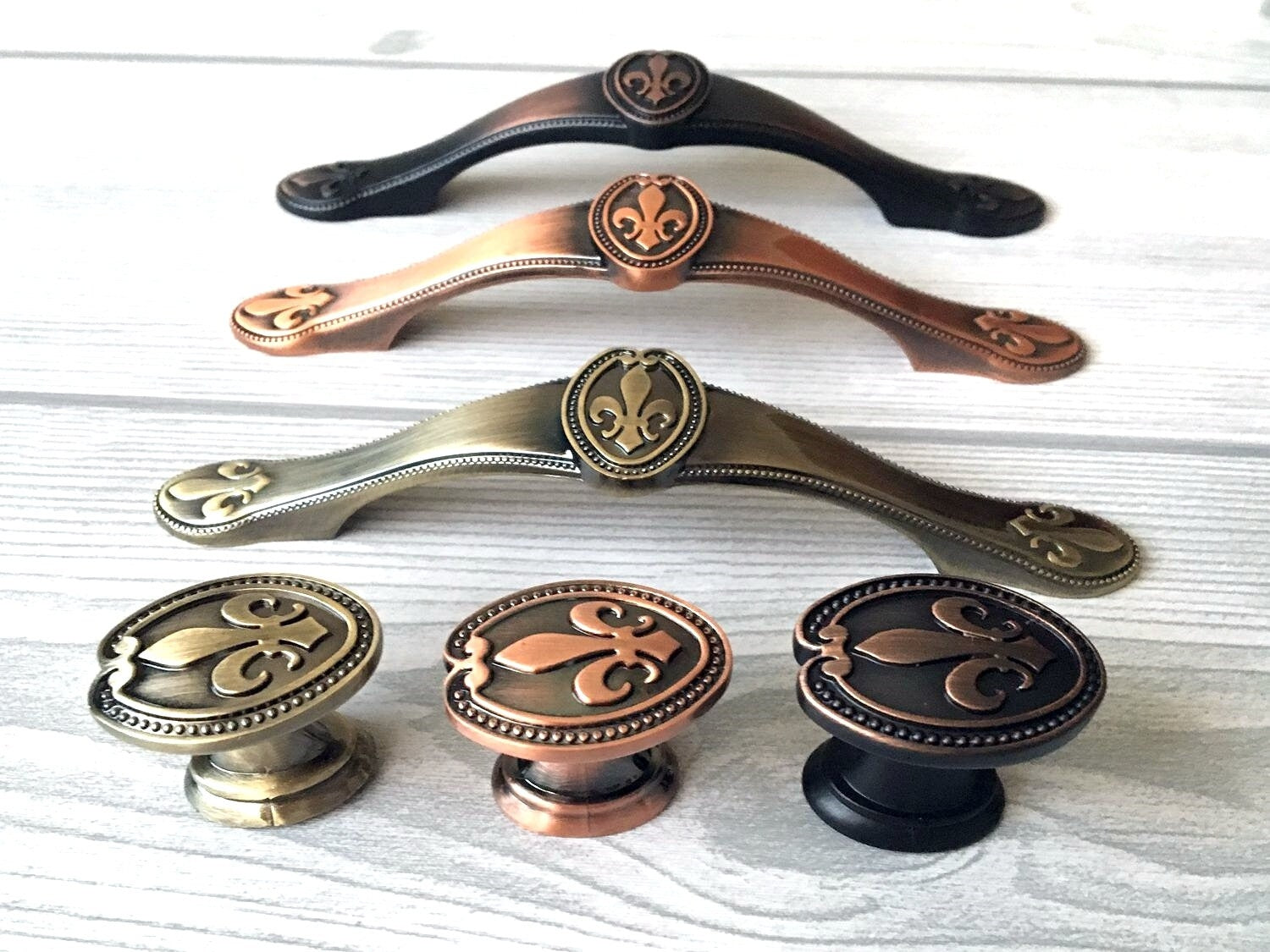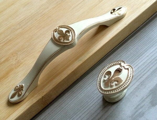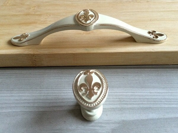Enhance your cabinetry with these Fleur De Lis pulls and knobs, designed with 3.75" centers for easy installation. Available in brushed bronze, red bronze, oil-rubbed bronze, and a creamy white with gold accents, each piece combines classic style with durable finishes. Ideal for adding a refined, timeless touch to your furniture while ensuring reliable functionality.