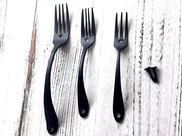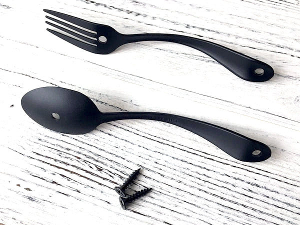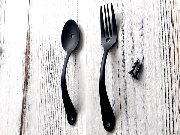 Elevate your kitchen cabinetry with these Spoon and Fork vintage-style cutlery pulls in antique black finish. Available in two designs and three sizes, these durable pulls combine retro charm with practical functionality. Their unique cutlery shape provides an eye-catching detail that complements classic and rustic decor.