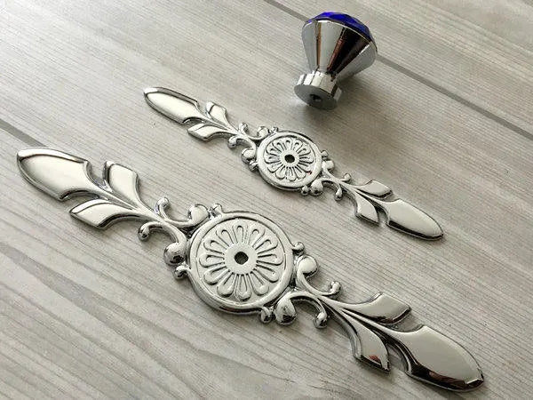 Blue Glass Drawer Knobs with Back Plate, Polished Chrome