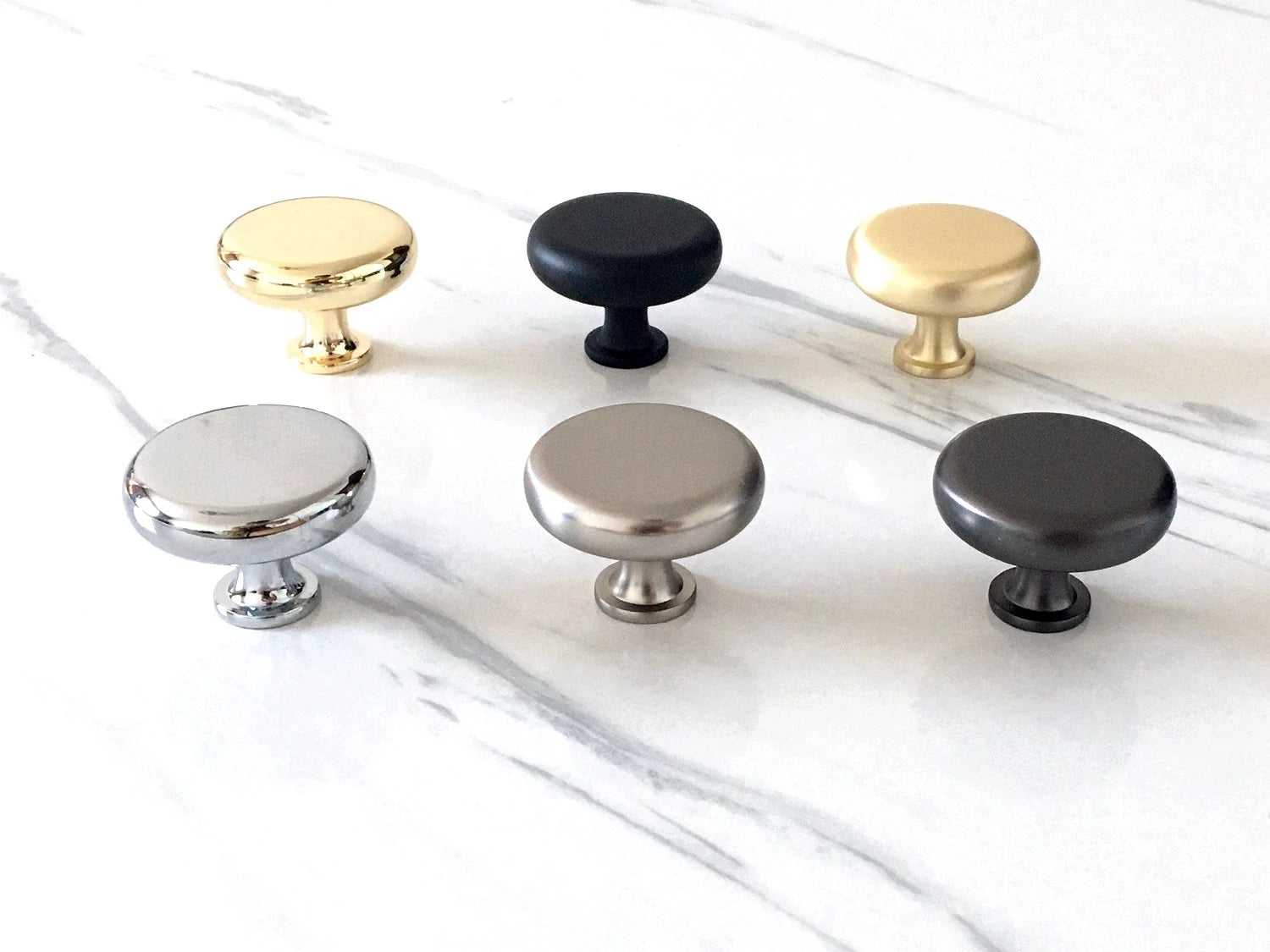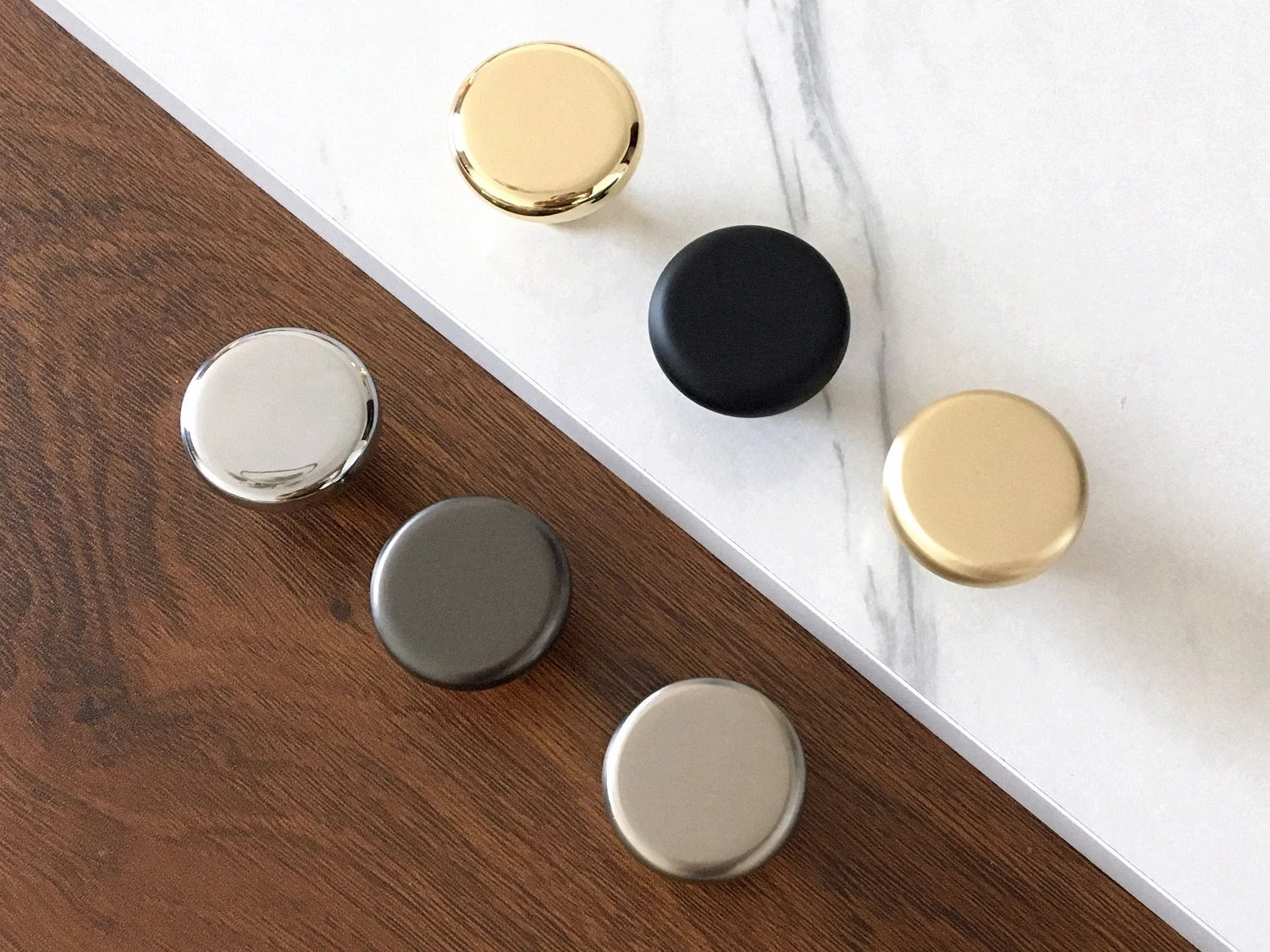 These round cabinet knobs are available in a variety of finishes including polished gold, brushed gold, dark gray, polished chrome, matte black and brushed nickel. Designed with a solid build and modern style, they provide durable and versatile hardware options to complement diverse interior designs while ensuring reliable functionality.