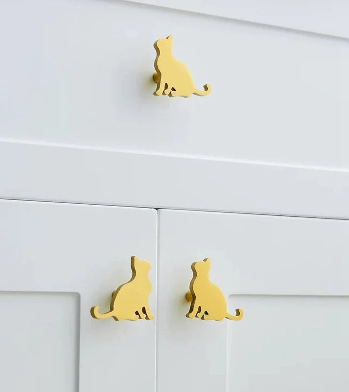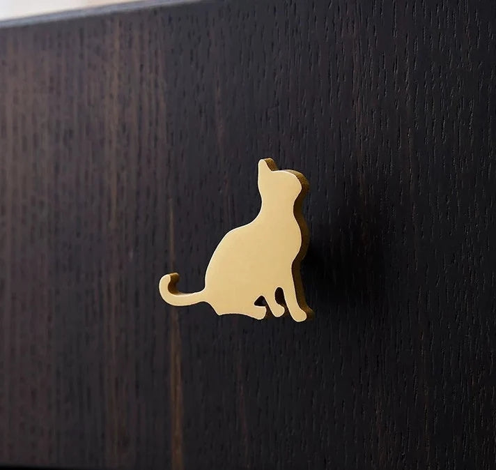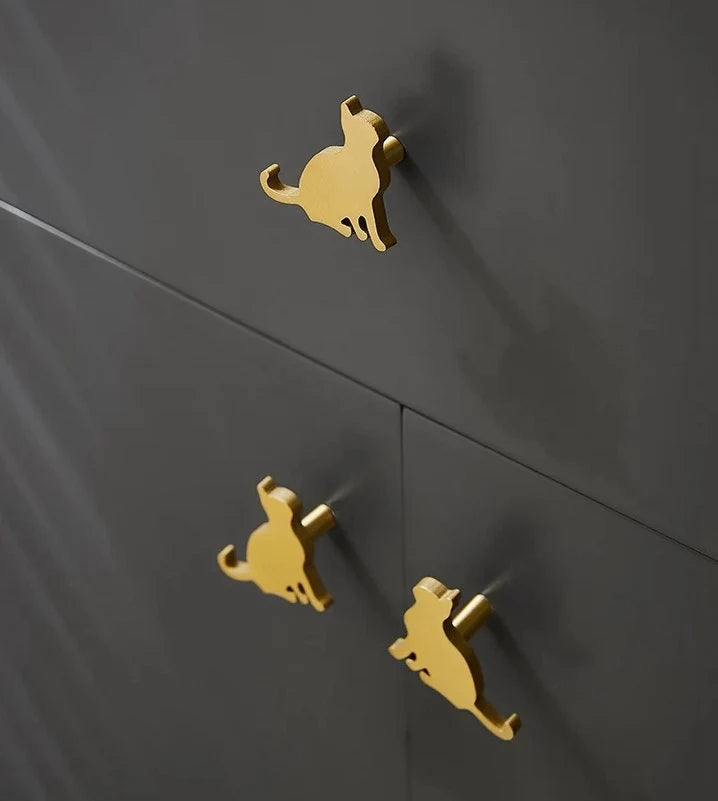 Crafted from solid brass with a refined gold finish, these cat-shaped drawer pulls feature a unique face-to-face design that combines durability with distinctive style. Ideal for enhancing cabinets and drawers, they offer exceptional quality and a charming decorative element for any furniture piece.