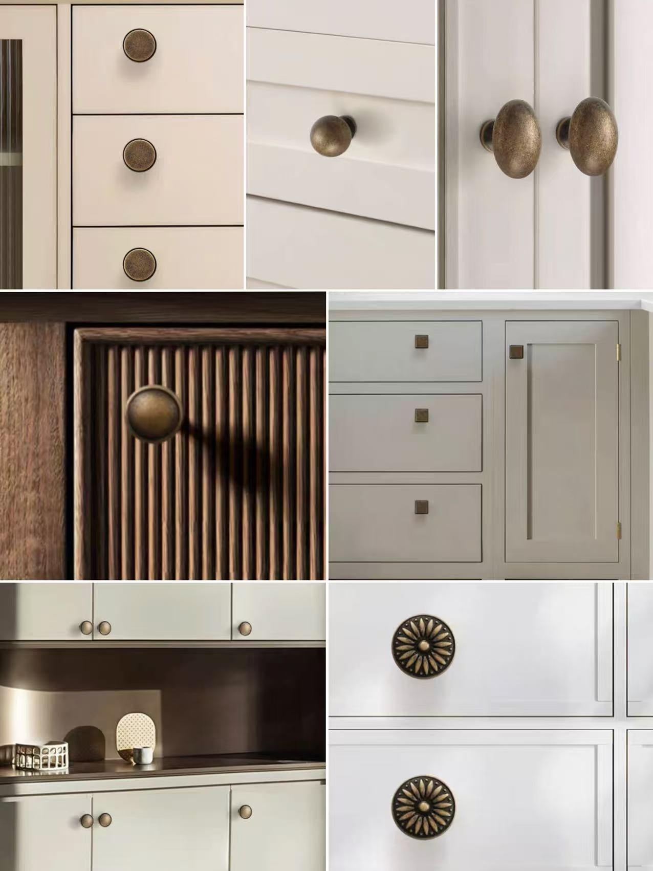These assorted brass aged bronze knobs, designed to complement retro vintage decor, provide an authentic antique look while ensuring durability and ease of use.