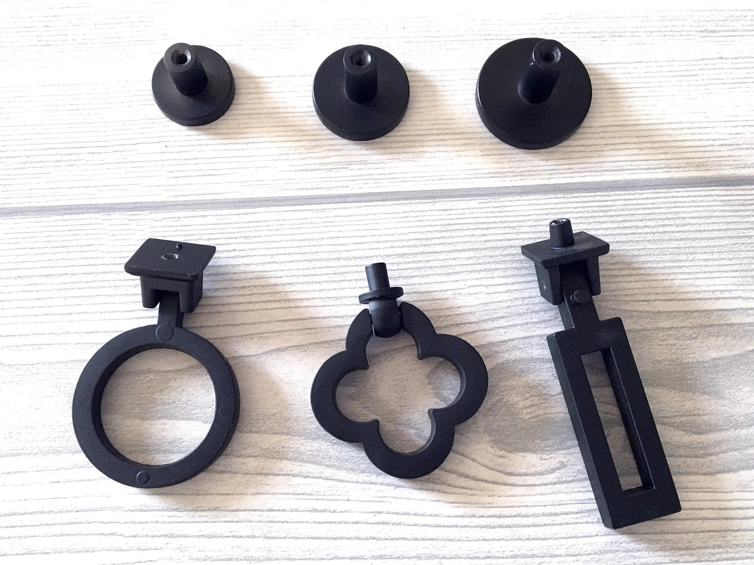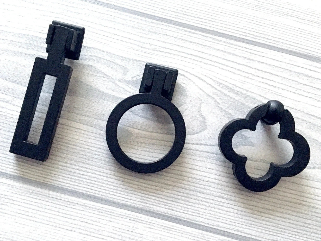 Enhance your cabinetry with these Drop Ring Drawer Pulls and Circle Cabinet Knobs, featuring a matte black finish for a modern, sophisticated look. The rectangular and clover-shaped drop rings offer a unique blend of geometric and organic design, providing both style and functionality.