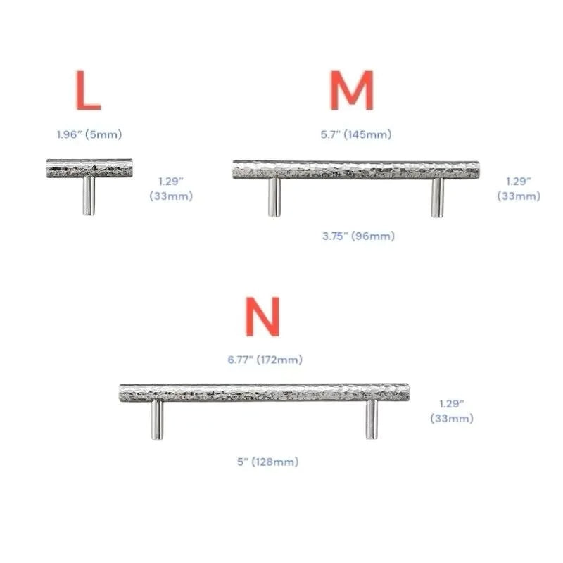 These hammered silver cabinet pulls are crafted from solid brass, offering durability and a refined look. Available in T-bar design and multiple sizes, they provide versatile options to enhance your cabinetry with a sophisticated touch. Ideal for both modern and classic interiors, these pulls combine strength with elegant style.