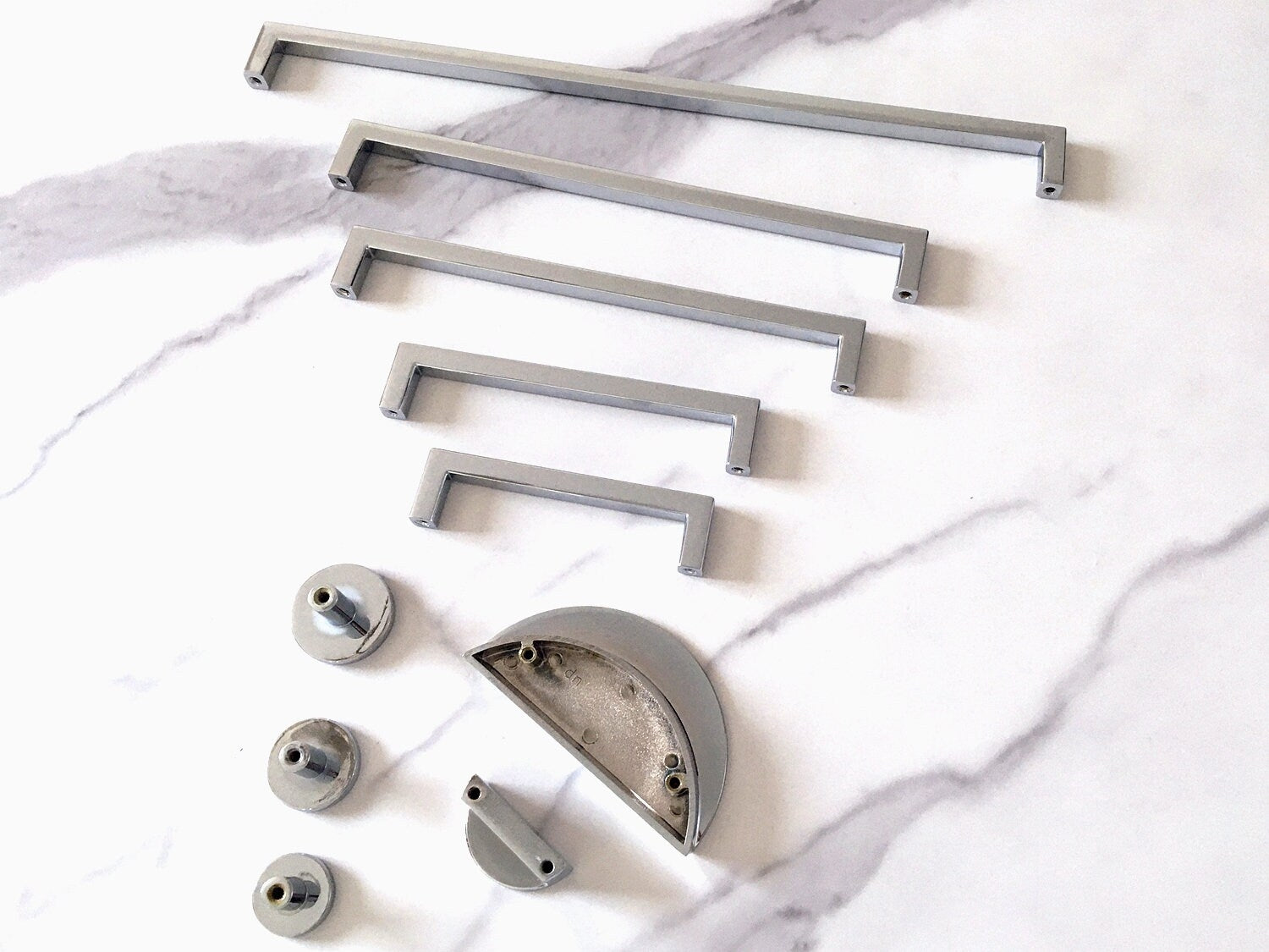 These slim square cabinet handles and half-moon drawer pulls offer a sleek, minimalist design in polished chrome, ideal for modern kitchens.