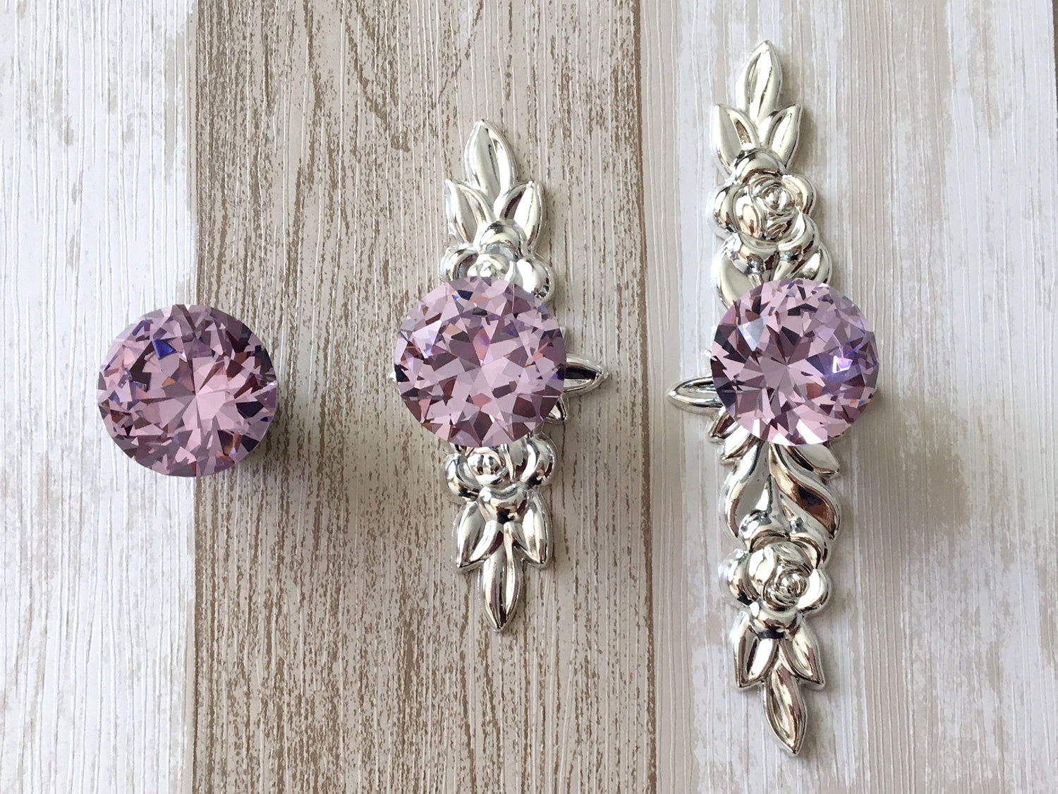 Pink Glass Drawer Knob with Floral Backplate, Polished Silver