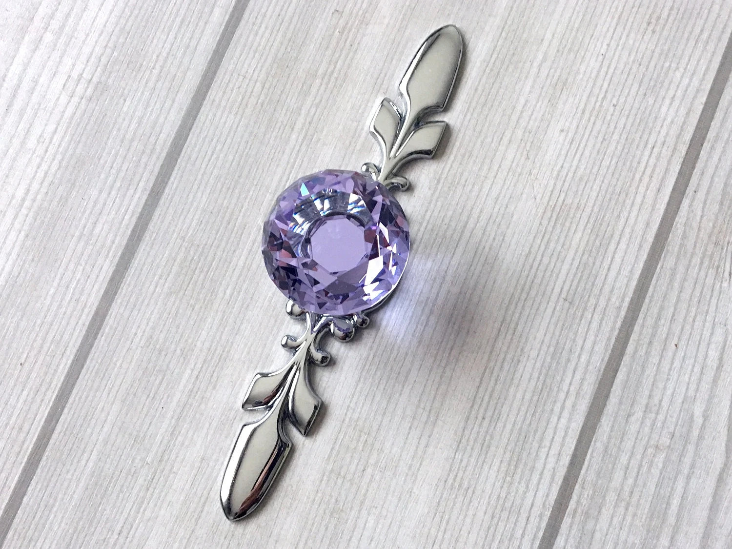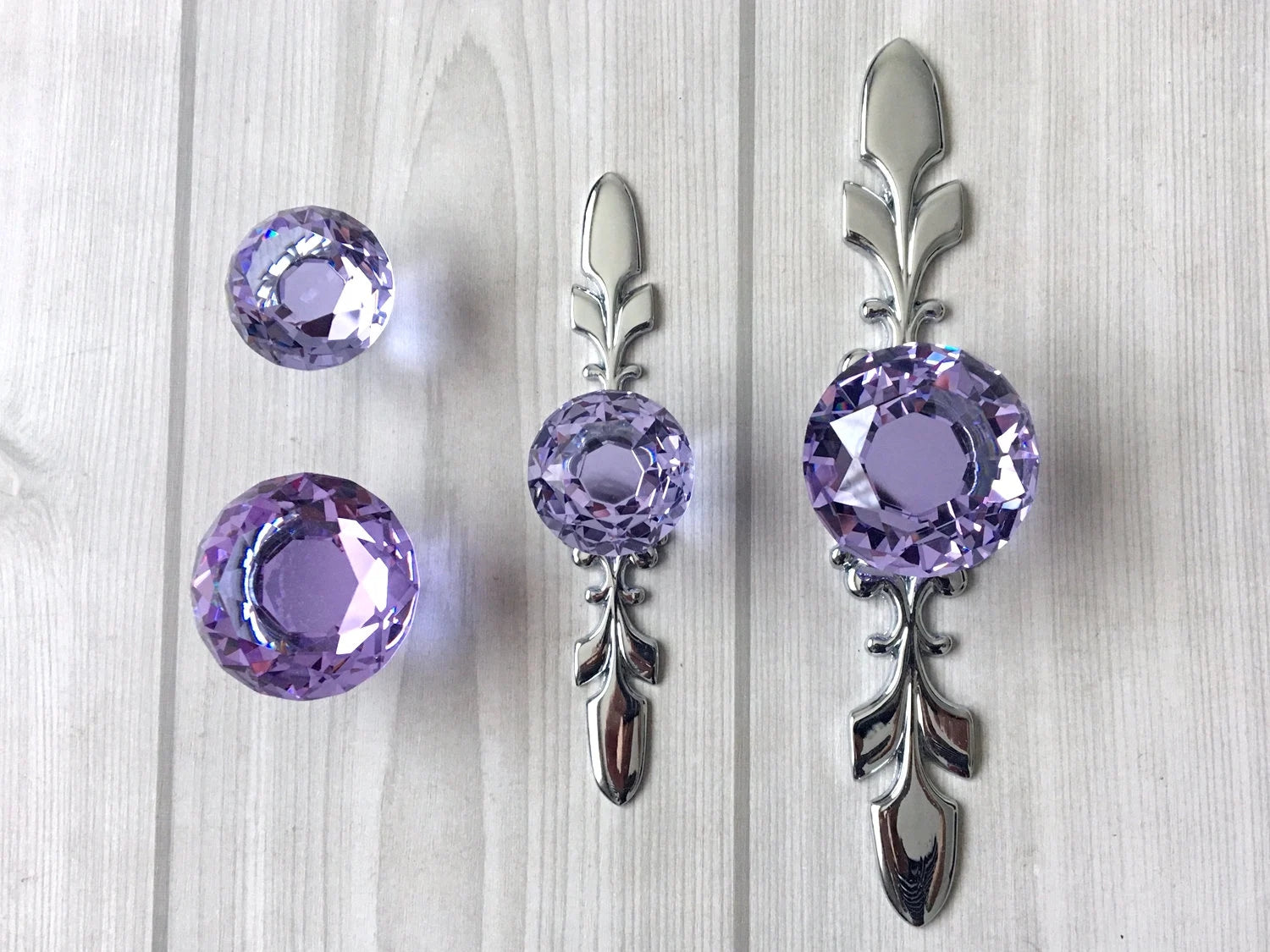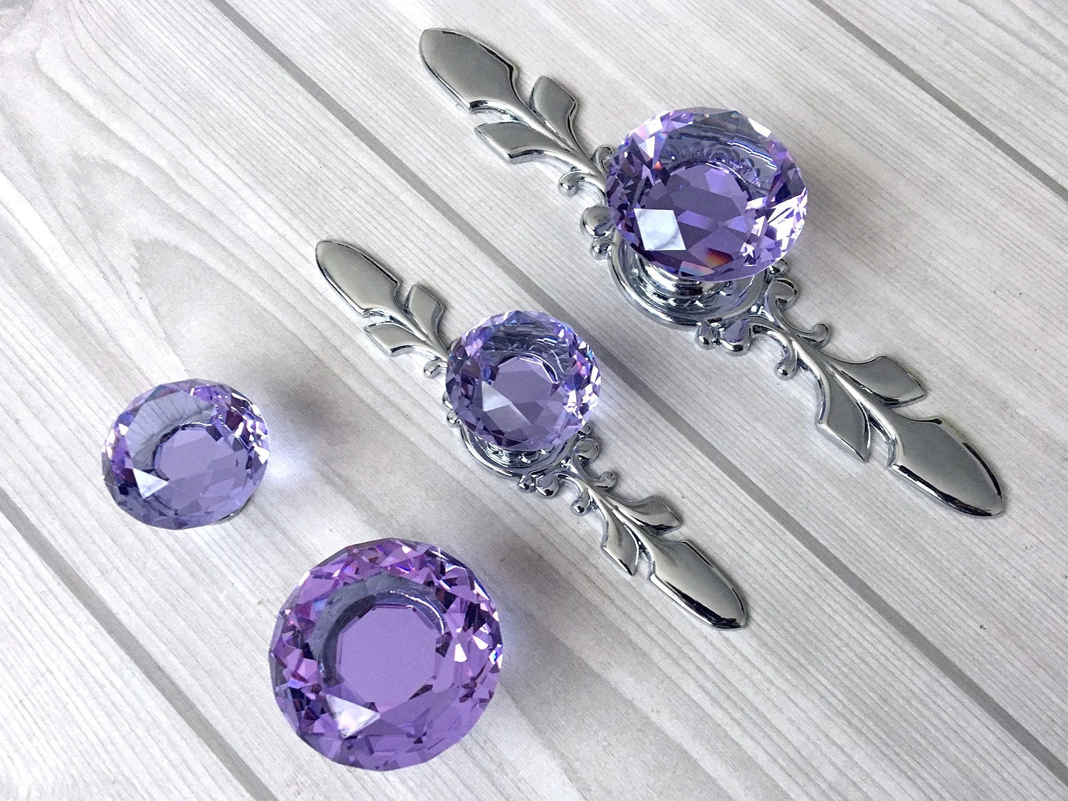 Purple Glass Drawer Knobs with Backplate, Polished Chrome