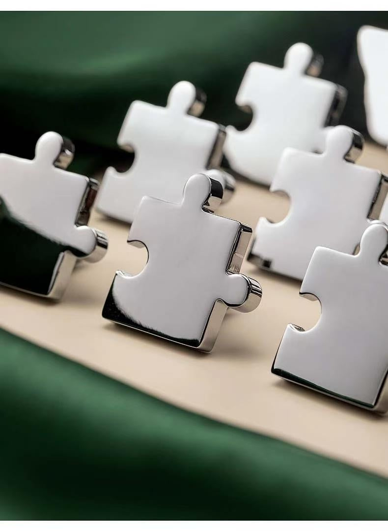 Elevate your nursery or kids' room furniture with these Puzzle Piece Brass Knobs. Crafted from solid brass with brushed brass, polished brass and polished chrome finishs, they offer both durability and a charming animal design.